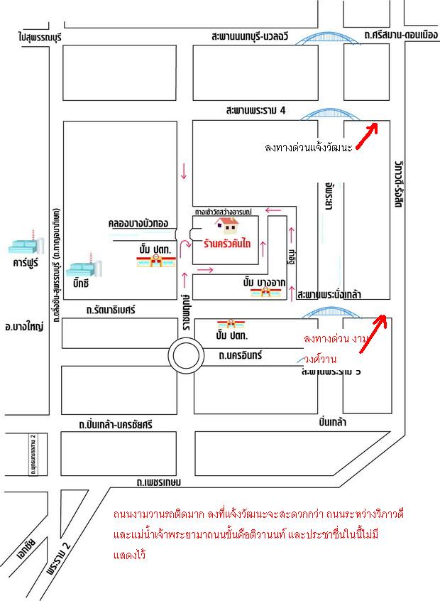 เพิ่มเติมแผนที่มีจุดลงทางด่วนทีใกล้สองจุด คือถนนงามวงศ์วาน และถนนแจ้งวัฒนะ ในแผนที่จากถนนวิภาวดีถึงสะพานข้ามยังมีถนนขั้นอยู่อีกสองแยกใหญ่ ถ้ายึดถนนราชพฤกษ์เป็นหลักครับจะได้ไม่หลง เส้นทางไม่ยากเพราะเป็นถนนใหญ่ทั้งหมด