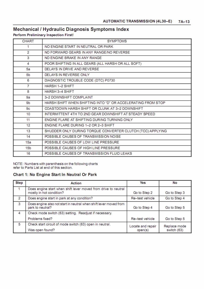 สรุปรวมปัญหาต่างๆที่อาจเกิดขึ้นได้ และตารางวิธีการตรวจสอบแก้ไข ตารางแรกคือการที่เครื่องไม่ยอมสตาร์ทในเกียร์ N หรือ P ถ้าสตาร์ทไม่ได้ จะมีสาเหตุหลักมาจากชุด Mode switch เห็นมีบางท่าเข้าใจว่าต้องสตาร์ทได้ที่ P เท่านั้นซึ่งเป็นการเข้าใจผิด ที่ถูกต้องต้องสตาร์ทได้ทั้ง P และ N หากไม่ได้ แสดงว่า Mode switch มีปัญหา
