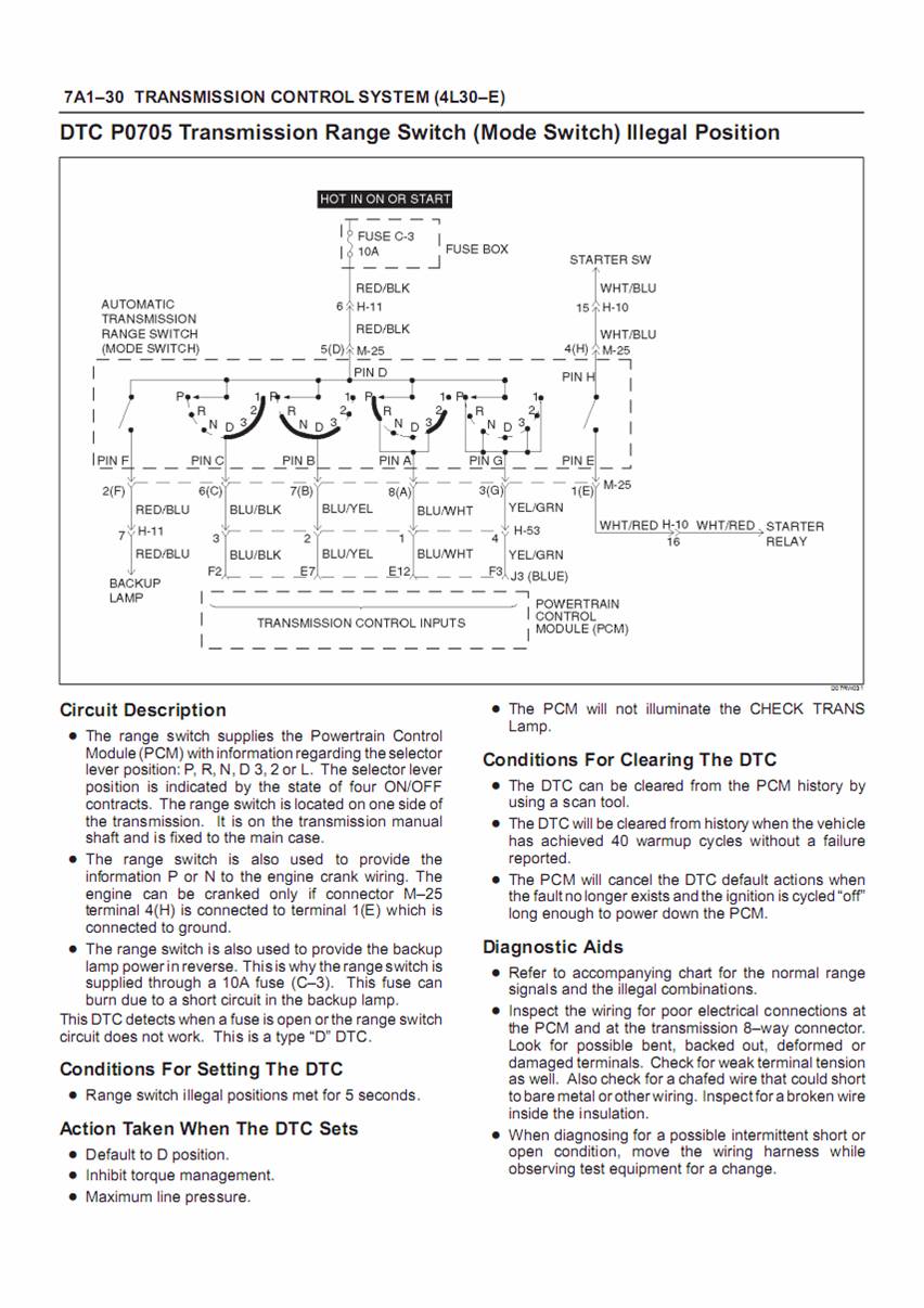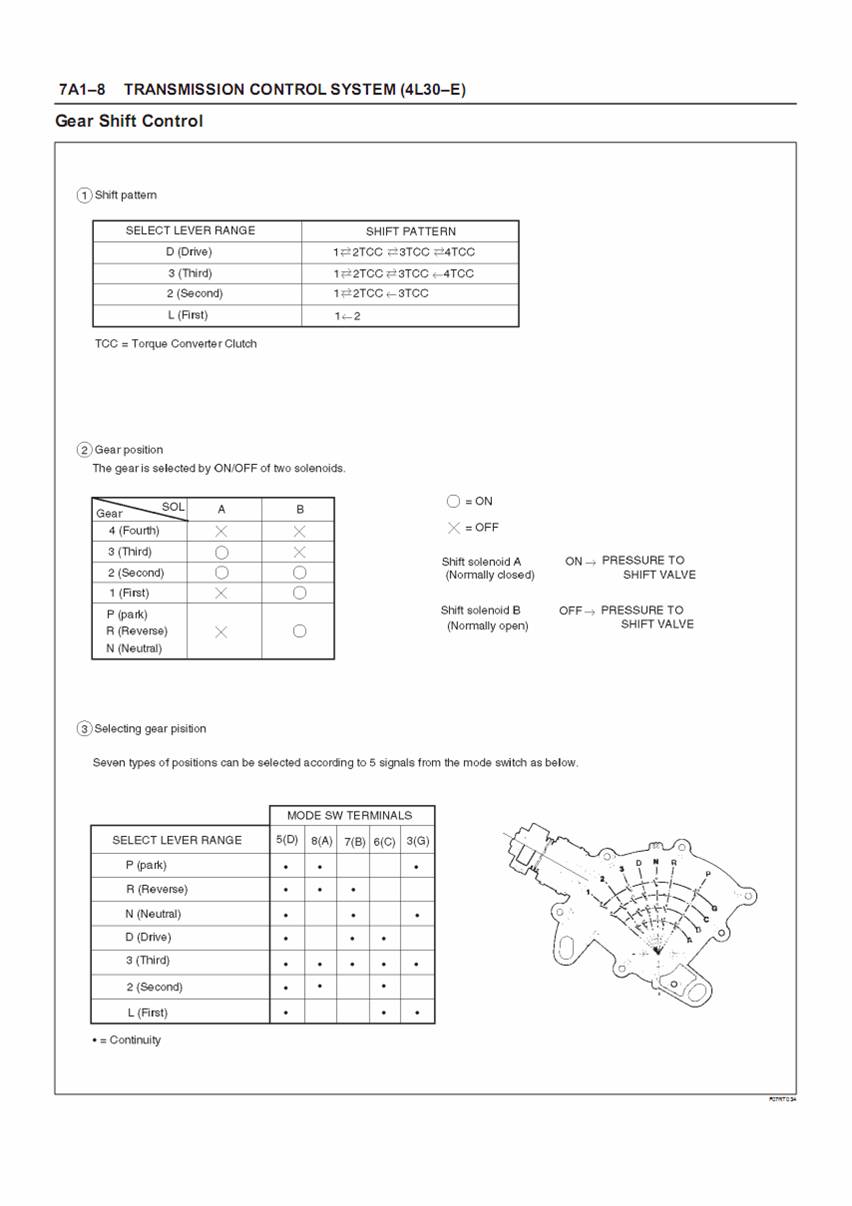 หัวข้อ 3 การทำงานของ Mode switch ในตำแหน่งเกียร์ต่างๆ ซึ่งหากสวิทช์ไม่อยู่ตรงตำแหน่ง สกปรก หรืออื่นๆที่ทำให่ contact ไม่ทำงานตามนั้น ก็จะทำให้มีปัญหา หน้า contact จะมีอยู่ 5 ตำแหน่งคือ D-A-B-C-G โดยแต่ละตำแหน่งจะเปิด-ปิด ไม่ตรงกัน ขึ้นอยู่กับตำแหน่งของเกียร์
