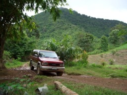 ปากทางที่ต้องวิ่งผ่านไร่ข้าวโพดสลับไร่กล้วยบนเขาเตี้ยๆประมาณ 2-3 กม.