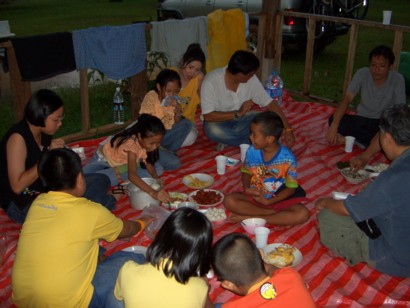 ฝนตกปอยๆทั้งคืน.. จึงไม่สามารถกางเต้นท์นอนที่สนามหญ้าหน้าโรงเรียนได้ ส่วนใหญ่หลบขึ้นไปกางเต้นท์บนระเบียงของโรงเรียน ส่วนครอบครัวคุณบุญหนัก(TOPER 9191)ก็อาศัยกางเต้นท์ในโรงอาหารที่เรานั่งกินข้าวกัน