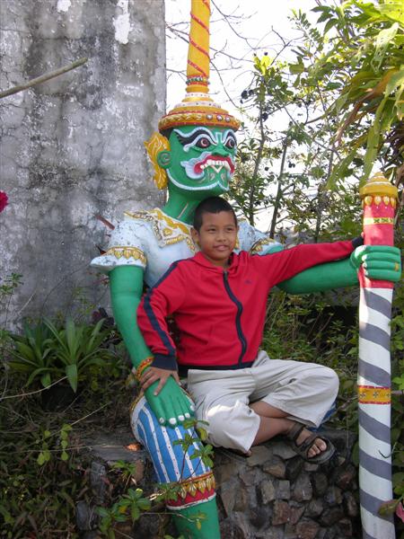 เด็กนั่งเล่นกับยักษ์เฝ้าบันได