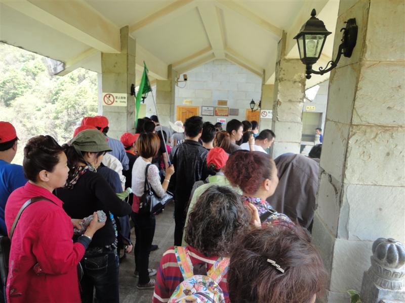 อย่างที่บอก ทัวร์ทุกบริษัทมีโปรแกรมเดียวกัน มาถึงพร้อมกัน แล้วยังกลับพร้อมกันอีก คิวขึ้นรถกระเช้าเลยจะยาวเป็นพอเศษ กระเช้าที่นี่เป็นแบบนั่งห้อยขา ทีละ 2 คน ใครที่ไม่เคยก็จะหวิวๆ
