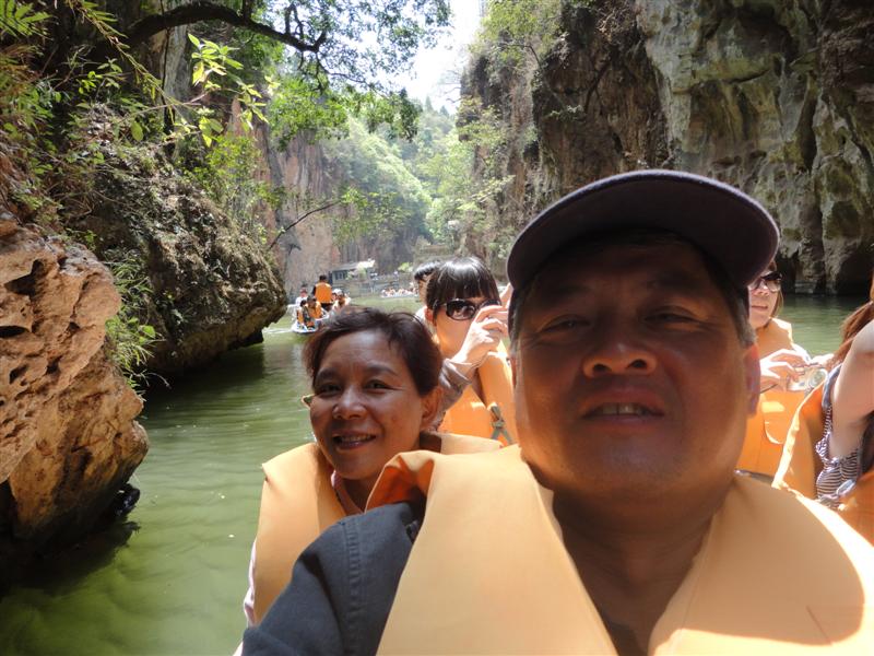 อย่างที่บอกว่าคิดผิดและตายตอนจบ พอขึ้นรถได้ แม่นางหวัง ไกด์สาวขอเราก็เจื้อยแจ้วเป็นนกแก้วนกขุนทองแบบ non-stop ตลอดกาลเดินทาง 1 ชั่วโมงแรก เล่าถึงสิ่งต่างๆของคุนหมิง ต้าหลี่ ลี่เจียง แชงกรี-ลา และอื่นๆ ซ้ำยังบอกว่าคุนหมิงเป็นที่สูง หลายๆคนอาจแพ้ความสูงโดยรู้สึกอ่อนเพลีย หายใจไม่ทัน และวิธีแก้มีทางเดียวคือห้ามนอนตอนเช้าก่อน 1100 โมง มาร้องอ๋อ ก็อีตอนที่รถทัวร์มาจอดที่ร้านแรก เป็นร้านขายทอง ประมาณ 40 นาที และออกเดินทางต่อ พร้อมกับมาจอดที่ร้านขายเครื่องเงินอีกประมาณ 40 นาที สรุปรวมแล้วเสร็จจากทั้งสองที่ประมาณ 1100 น ไม่ขาดไม่เกิน แล้วจึงออกเดินทางต่อไปร้านอาหาร ถึงร้านอาหารประมาณเที่ยง กินข้าวเสร็จออกเดินทางมาที่ถ้ำ ถึงถ้ำประมาณบ่ายโมงเศษ โดยบอกว่าให้เวลาเดินเที่ยวถ้ำ 2 ชั่วโมง โถ..แม่นางหวัง เฉพาะซื้อของ 2 ที่รวมกัน 1.5 ชั่วโมง แล้วยังไม่รวมเดินทางออกนอกเส้นทางอีก ให้เวลาเดินเที่ยวจริงๆ น้อยกว่าเวลา shopping เสียอีก เก็บความอัดอั้นตันใจไว้ เพราะลงเรือมากับเขาแล้ว มิมีทางเลือก