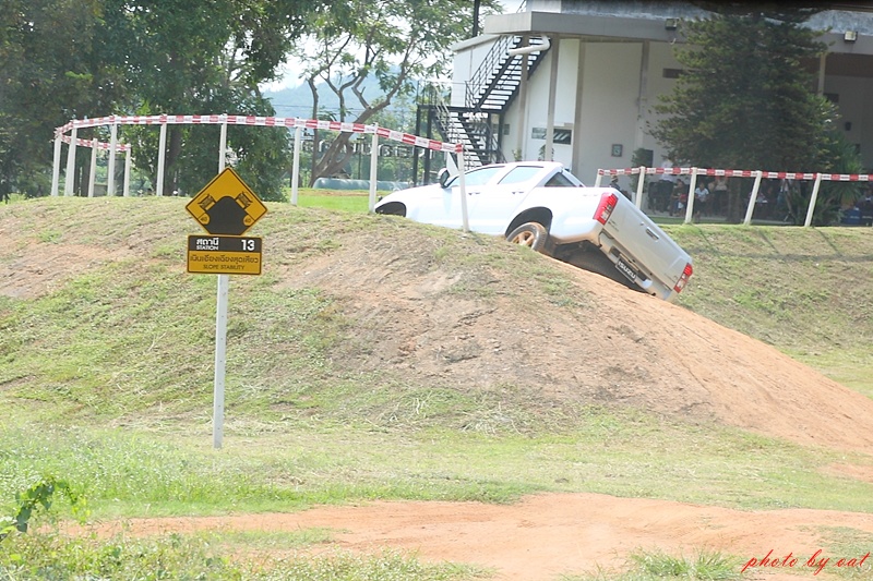 ดูด้านข้างนะครับ ด่านเดียวกันแต่รถคนละคัน โดยด่านนี้จะทดสอบสมรรณะของรถ 4x4 สามารถใช้งานแม้จะมีล้อใดล้อหนึ่งลอยจากพื้นโดยใช้การขับเคลื่อนเพียงสามล้อ