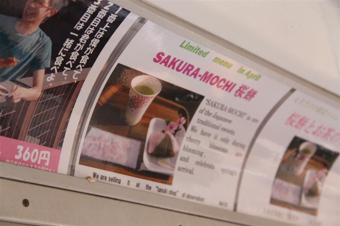 มีป้ายโฆษณา Sakura mochi ซึ่งจะมีขายเฉพาะเดือนเมษายนเท่านั้น ผมไม่ได้ลองที่นี่ แต่ได้มีโอกาสลองในโตเกียว รสชาดใช้ได้ เสียอย่างเดียว อะไรๆก็แพงไปหมด
