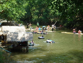 ริมแก่งจะมีแพให้นั่งเล่นพร้อมอาหารบริการ