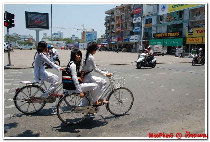 ผมชอบรูปนี้มากเลยครับสาวเวียดนามสองคนช่วยปั่นจักรยานโดยใช้ที่พักเท้าอันเดียวกัน แสดงถึงความสามัคคีไม่เอาเปรียบกันและกัน