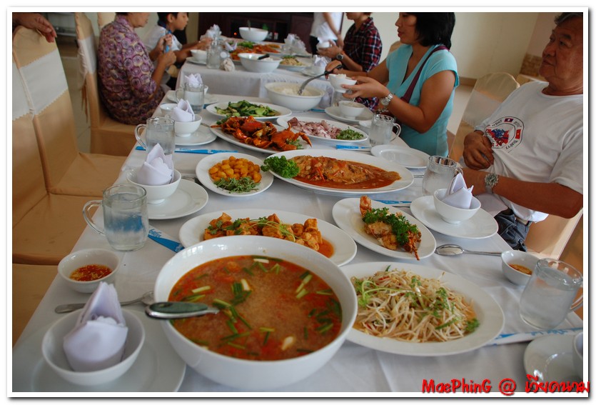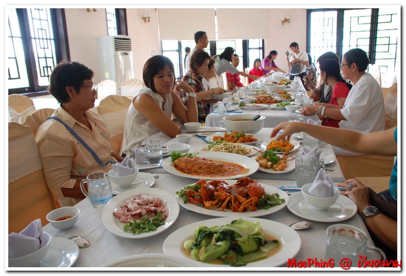 หลังจากที่สมาชิกเราเหมาเรือใบจวนจะหมดร้าน ทางไกด์ก็พาไปทานข้าวเทียงกันที่ภัตตาคารอะไรจำไม่ได้ "ตาลาย"ครับ อาหารมาเต็มโต๊ะเลย