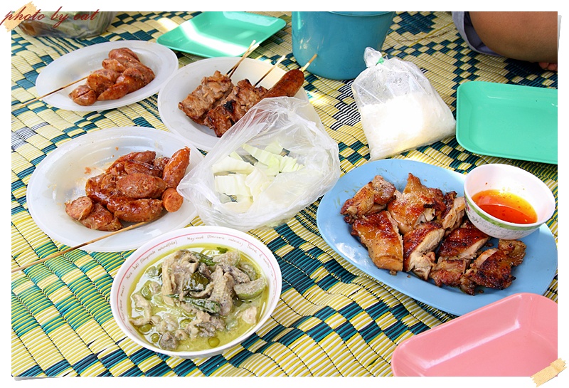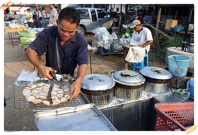 เลยมาแวะตรงแถวตลาดสดยามเช้าบริเวณไกล้ ๆ ปั้มแก๊สแถวทางเข้าน้ำพุร้อนหินดาดครับ หาซื้อเสบียงตุนไว้ยามเที่ยงก่อน ผมได้ขนมครกกับหมูย่างข้าวเหนียวติดมือมาครับ