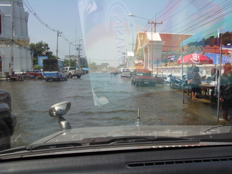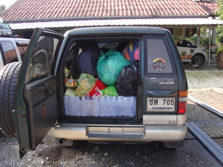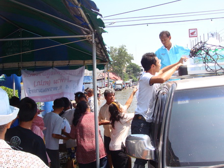 ถึงหน้าวัดมณีชลขันธ์แล้วครับ จุดที่จะแจกข้าวจุดแรก