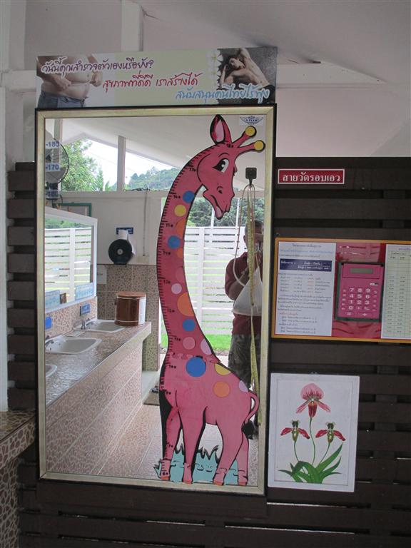 ห้องน้ำที่นี่จะเน้นเรื่องสุขภาพด้วย โดยมีสายวัดและตาชั่ง (สายวัดเอาไว้วัดพุง อย่าเอาไปใช้วัดอย่างอื่น เดี๋ยวผิดวัตถุประงค์) พร้อมทั้งมีตารางบอกน้ำหนักที่เหมาะสม ใครที่มั่นใจในขนาดและน้ำหนักที่เหมาะสม ก็ขอเชิญตรวจสอบได้ ใครไม่แน่ใจอย่าลอง เดี๋ยวจะเป็นทุกข์ซะเปล่าๆ
