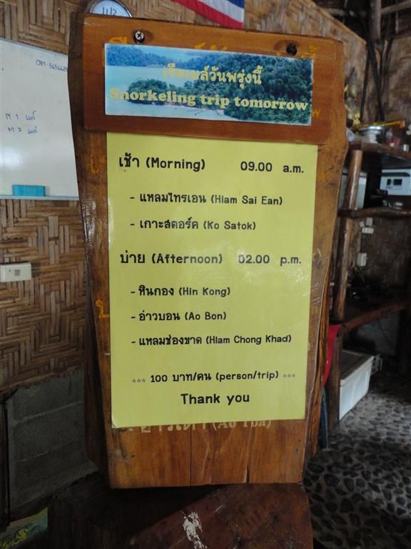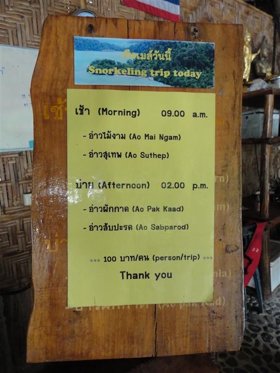 ค่าเรือไปดำน้ำ รอบละ 100 บาท ใช้เวลาประมาณ 2 ชั่วโมงต่อรอบ วันละ 2 รอบ (0900-1100 และ 1400-1600) 2 วัน 4 รอบ รวม 400 บาทต่อคน สถานที่เดินทางแต่ละรอบไม่ซ้ำกัน สรุปรวมค่าใช้จ่ายที่เกาะ 80+160+200=440 ต่อคน ไม่รวมค่าเรือ ค่าอาหาร