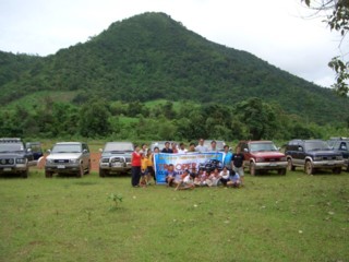 เตรียมตัวถ่ายหมู่โดยมีฉากหลังเป็นยอดเขาเทวดา
