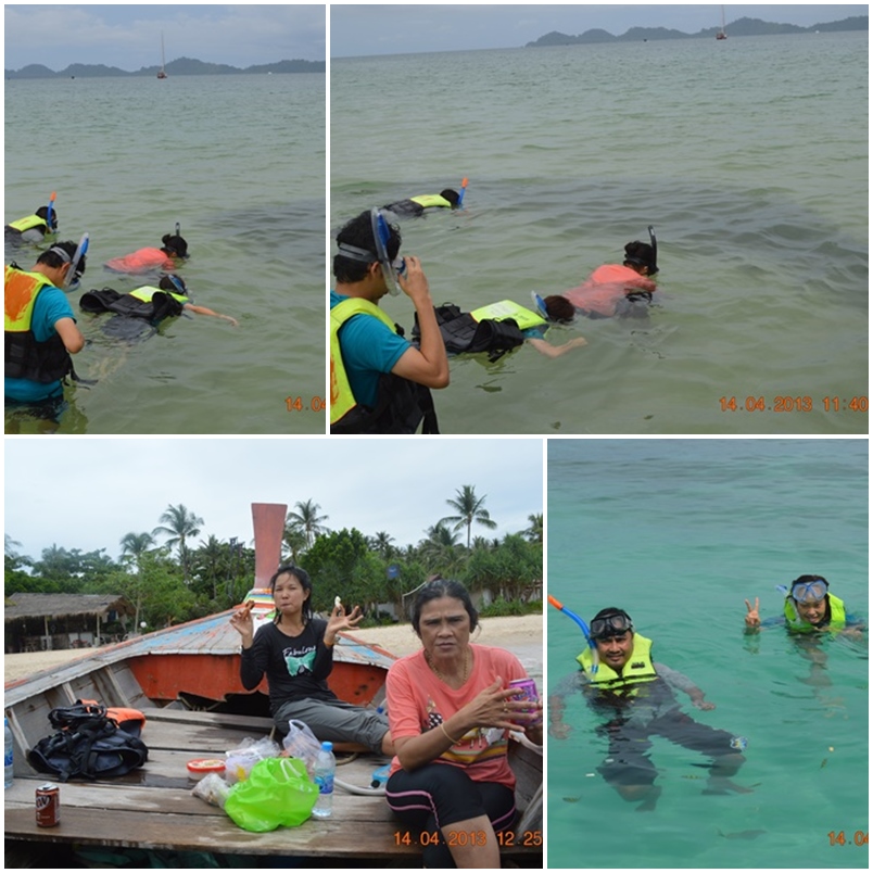 เที่ยงแล้วมาแวะกินข้าวกันที่เกาะมุก ทำอาหารมาเองกินบนเรือเลย กินเสร็จฝึกความชำนาญการใช้หน้ากากต่อ ที่เห็นดำๆในน้ำเป็นฝูงปลาตัวเล็กๆเยอะมากดำลงดูสวยจริงๆ