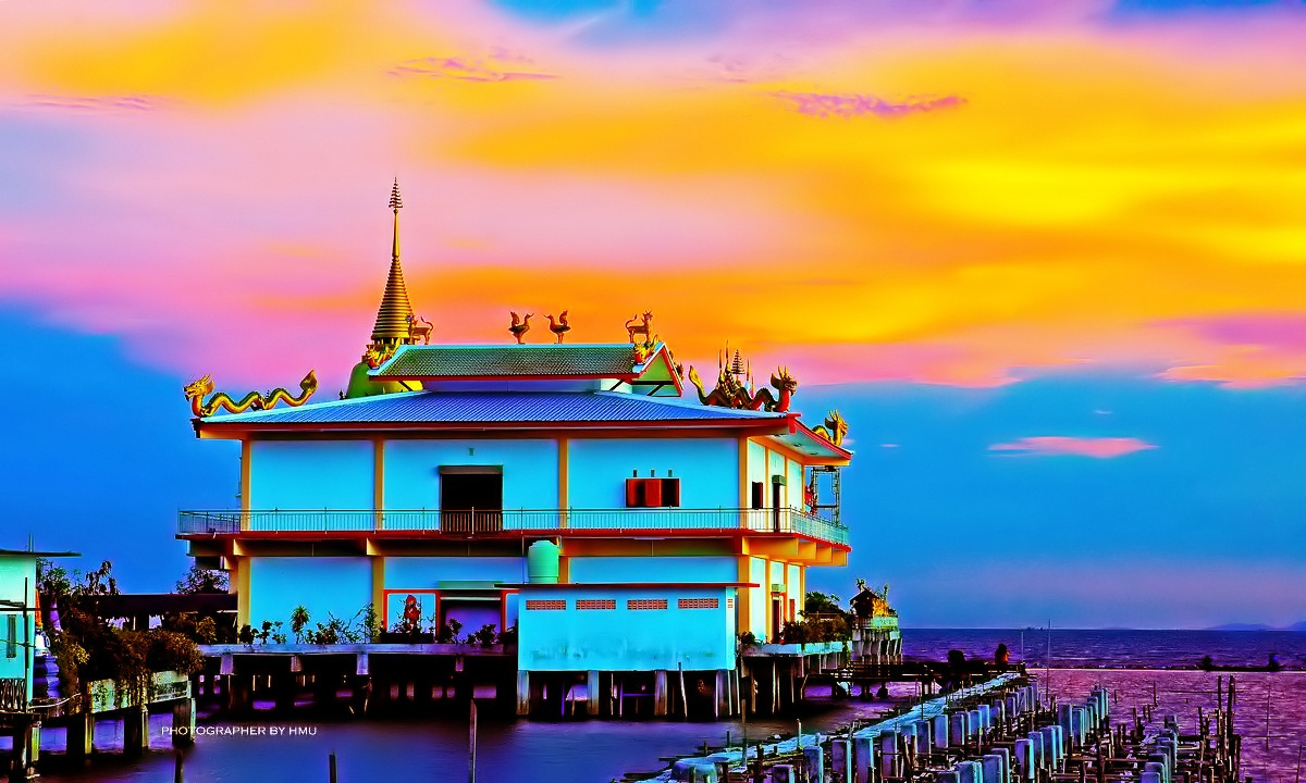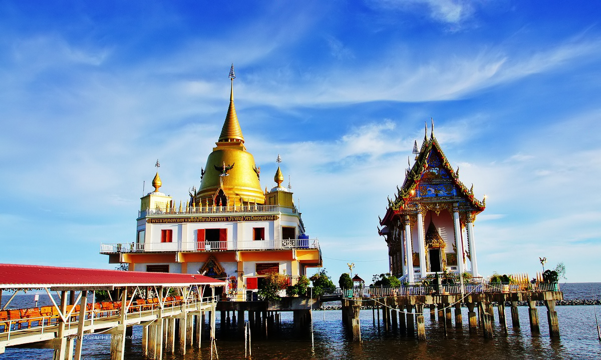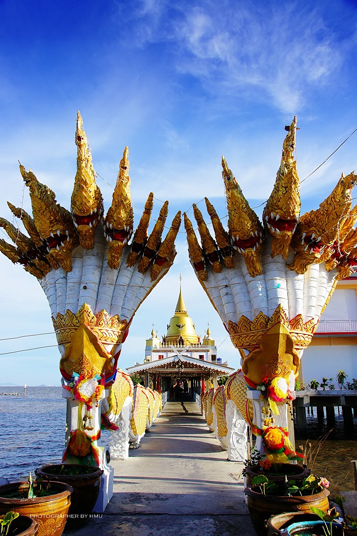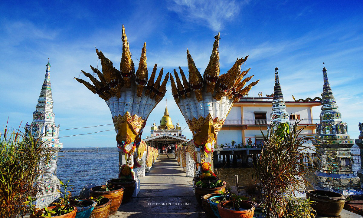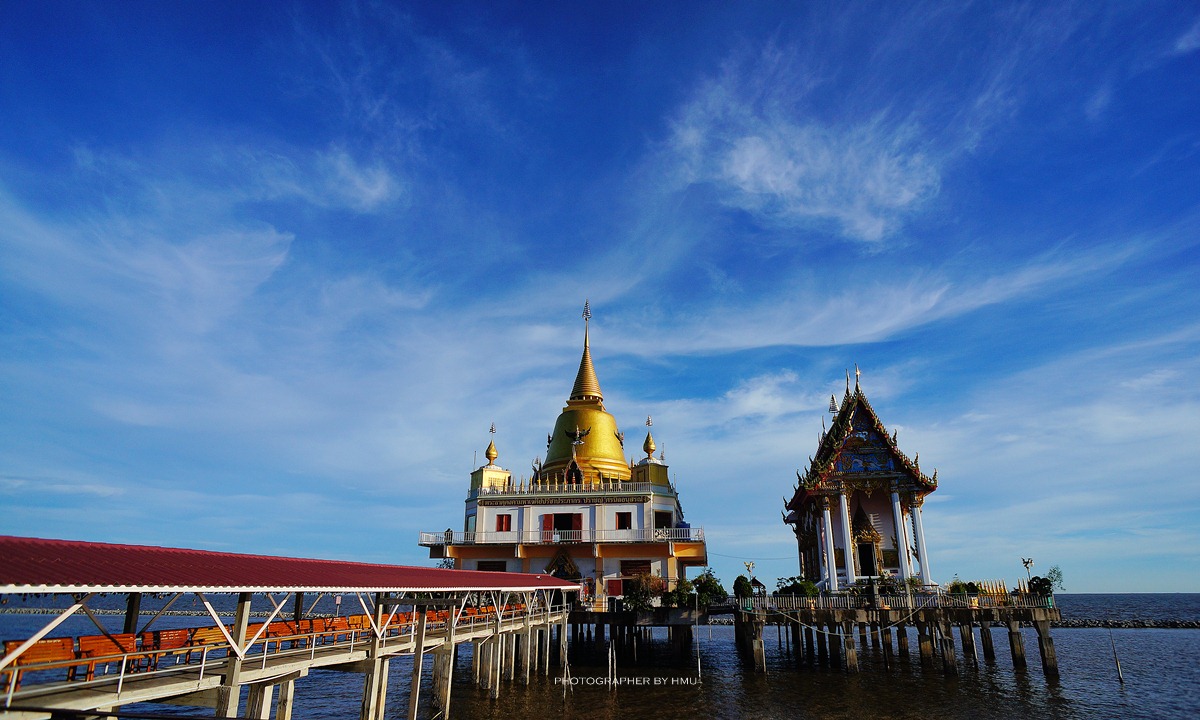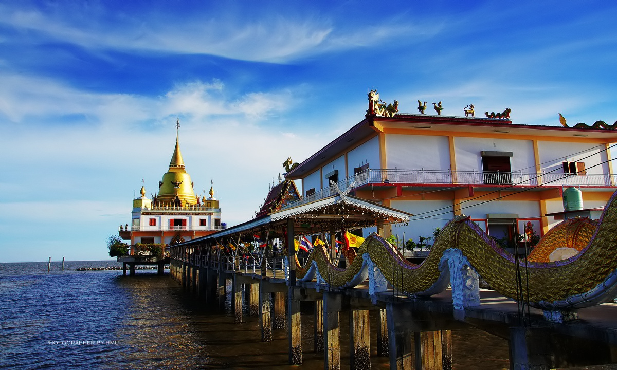 และอุโบสถซึ่งอยู่ในทะเล เจดีย์มี 5 ชั้นมีภาพวาดเกี่ยว กับพุทธศาสนาและพระมหากษัตริย์ไทย และประดิษฐานพระพุทธรูปต่าง ๆ ส่วนชั้นบนสุดเป็นเจดีย์สีทองอร่ามบรรจุพระอรหันต์ธาตุ สามารถมองเห็นทัศนียภาพท้องทะเลและแผ่นดินในมุมสูงได้สวยงาม