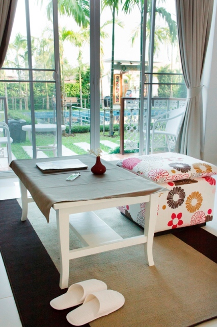 จากห้องนั่งที่โซฟามองไปเห็นทั้งสวน ทั้งสระว่ายน้ำ ก็ชิลด์ไปอีกแบบ ที่สำคัญ เงียบมากกกกก ชอบตรงนี้แหละ
