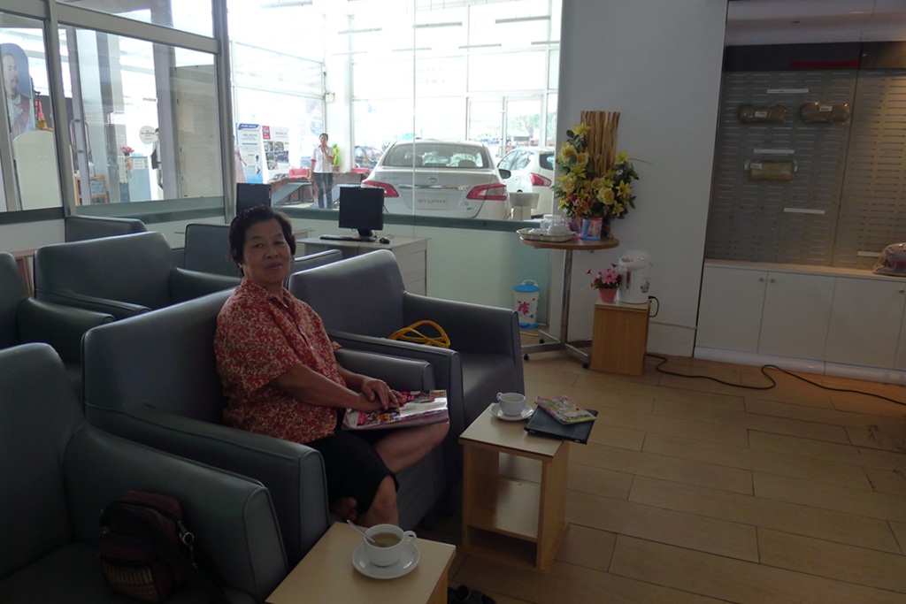 แม่บัวไปนั่งรอที่ห้องรับรองลูกค้าของนิสสัน
