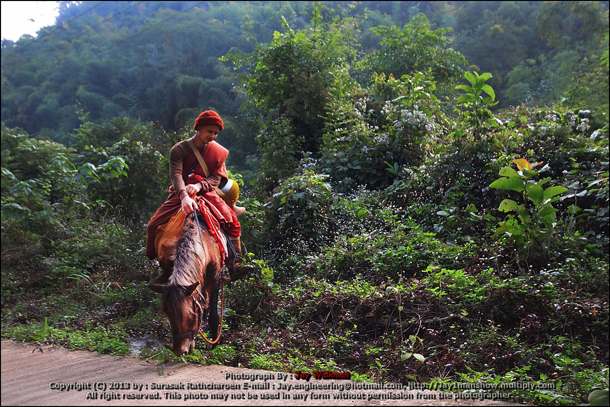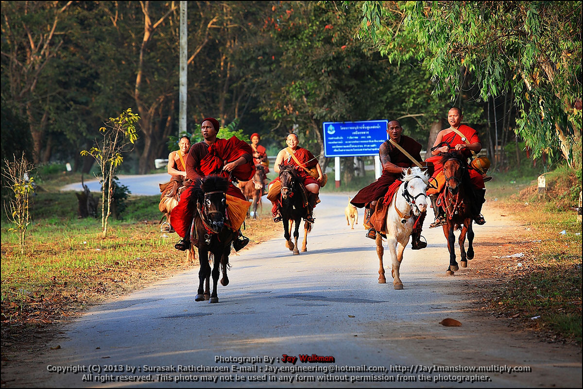 หลังจากรออยู่นานประมาณ 8 โมงเช้าพระก็ควบม้ามาอย่างไว พวกผมดักรอตรงทางขึเนวัดครับ แต่ก็ไม่แน่เสมอไปว่าท่านจะมาทางนี้ เพาะเว้นทางบิณฑบาตรนั้นเป็นวงกลม