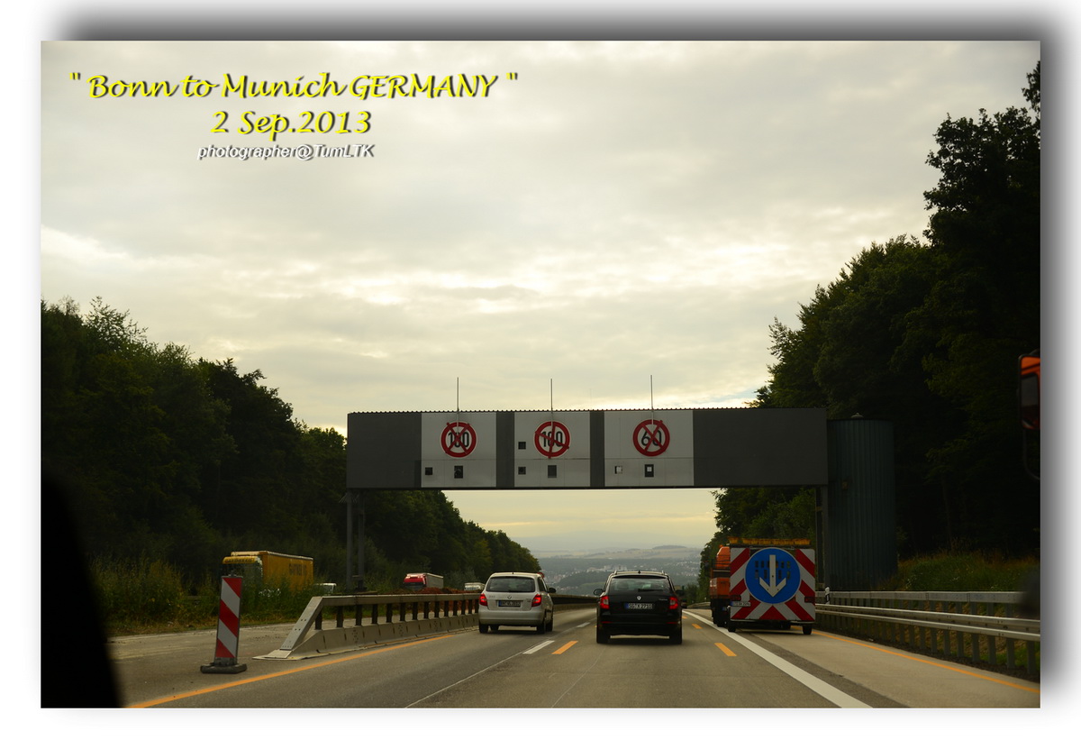 เวลา 08.30 น.ของวันที่ 2 ก.ย.56 รถ Ford รุ่น Galaxy Diesel 5 ประตู 7 ที่นั่ง ก็นำพวกเราทั้ง 7 คน ออกเดินทางจาก witterschlick โดย มี Mr.Yokle เพื่อนชาวเยอรมัน ทำหน้าที่เป็นพขร.ให้ เนื่องจากเป็นผู้ชำนาญทาง แต่ผู้เดียว ในทริปนี้...อิอิ.(มีฝรั่งคนเดียวที่ไปกับเรา) ผมนั่งหน้าคู่กับ Yokle คอยเก็บภาพ พอขึ้นทางด่วน(Autobahn)ได้ พขร.ของผมก็เหยียบคันเร่งอย่างไม่ทนุถนอมเลยละครับ..ผมถามแกว่า.ทางด่วนที่นี่มีขีดจำกัดเท่าไร..แกตอบอย่างหน้าตาเฉยเลยครับว่า.unlimit..นี่ขนาดผมแอบมองเรือนไมล์ของรถ.ก็ฟาดไป 170-180 กม./ชม.แล้วละครับ Oh! My God. ระยะทางจาก บอนน์ ถึง มิวนิค ประมาณ 600 กม.ถ้าวิ่งความเร็วขนาดนี้เราจะใช้เวลาประมาณไม่เกิน 4 ชม.ก็ประมาณ บ่ายโมงก็ถึงแล้ว แต่ถนนที่นี่ก็เหมือนกับถนนเมืองไทยก็ตรงที่ว่า ตลอดระยะทางก็มีการซ่อมถนน เป็นระยะๆ จาก 180 ก็ลดลงมาคลานต้วมเตี้ยมเป็นเต่าเหลือแค่ 20 กม./ชม.ก็มีเหมือนกัน..ผมชอบทางด่วน(Autobahn) ของเยอรมันก็ตรงทีมันเรียบมาก ไม่เป็นคลื่นเหมือนบ้านเรา และไม่เสียเงินค่าทางด่วนสักยูโรเลยครับ เพื่อนผมบอกว่า ที่เยอรมันไม่มีการคอรัปชั่นครับ ภาษีที่เก็บมาจึงถึงมือประชาชนโดยมาทนุบำรุงท้องถิ่นไม่ว่าจะเป็นการสร้างถนน ระบบราง ระบบน้ำ ระบบไฟฟ้า การดูแลประชาชนที่ตกงานก็มีเงินเดือนกินครับ มีค่าเช่าบ้านให้อีกด้วย ทำไมมันต่างจากบ้านเราราวกับฟ้ากับเหวเลยครับ..อิอิ.เป็นความคิดเห็นส่วนตัวนะครับ..