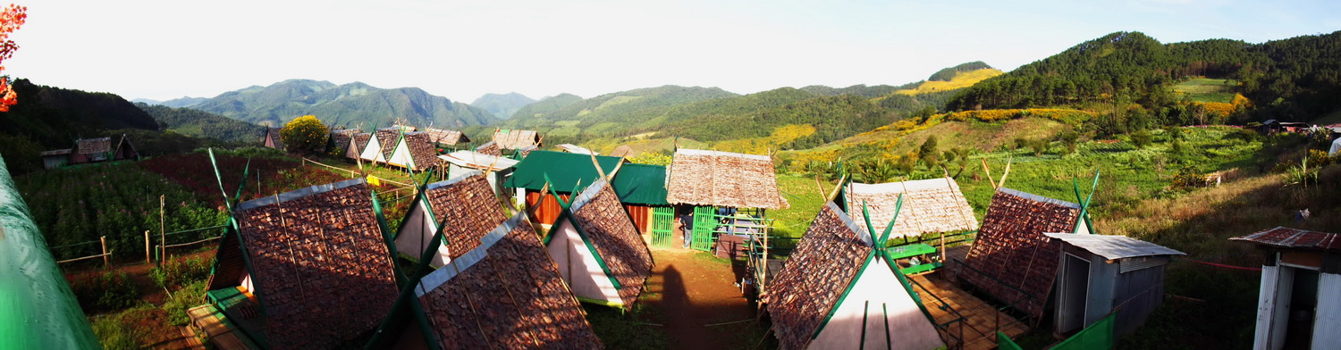 มืดก็มืด มองอะไรไม่เห็นเลย ไฟก็ไม่ค่อยมี ที่แรก ก็เจอกระต๊อบเป็นแถวอันนี้แหละ ชลอ ๆ รถ ในใจก็คิดว่า ลองขี่ขึ้่นไปดูอีกสักหน่อยนึง เพราะป้ายบอกว่า อีก 3 กิโล ถึงทุ่งบัวตอง ขี่ไปได้สักกิโล ก็เจอร้านค้าร้านอาหาร และก็มีกระต๊อบอีกเหมือนกัน จึงจอดรถ ลงไปถามว่า มีที่พักรึป่าว เจ้าของรีสอร์ทบอกว่า จองไว้รึป่าว ผมบอกว่า ไม่ได้จองไว้ เขาพูดตอบกลับมาว่า เต็มหมดแล้ว ลองขึ้นไปดูข้างบนดูสิ มีบ้านพัก และที่กางเต้นท์อยู่ข้างบนอีก ผมจึงขี่ขึ้นไปอีกสัก 1 กิโล ก็เจอที่ทำการ แต่ก็ดูเหมือนว่าไม่เวิร์ค จึงขี่ขึ้นไปอีก ขึ้นถึงตรงโค้งพับผ้ายอดนิยมนั้นแหละ เห็นเขากางเต้นท์กันอยู่ จึงจอดรถลงไปถามดูว่า เขานอนกันที่ไหนยังไง นักท่องเที่ยวคนหนึ่งก็บอกผมว่า ยังมีที่ว่างให้กางเต้นท์เหลืออยู่ ห้องน้ำอยู่ด้านล่าง แต่จากสภาพที่เป็นกลางคืน มองอะไรแทบไม่เห็น หนาวก็หนาว เหนื่อยก็เหนื่อย หิวก็หิว ไอ้เต้นท์ที่เอาไป สายยางร้อยเสาก็ขาด ยังไม่ได้ซ่อมกว่าจะกางได้ ก็คงเสียเวลาน่าดู ตัดสินใจ ลงไปข้างล่างจุดแรกเลยดีกว่า ยอมเสียตังค์ดีกว่า เพราะเหนื่อยแย่แล้ว ไม่ไหวแล้ว