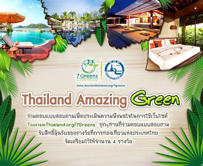 ร่วมตอบแบบสอบถามความพึงพอใจในเว็บไซต์ www.TourismThailand.org/7Greens พร้อมลุ้นรับแพ็คเกจมูลค่ารวมกว่า 70,000บาท
