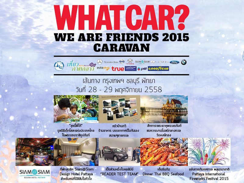 เชิญร่วมกิจกรรม WHATCAR? WE ARE FRIENDS 2015 CARAVAN เส้นทางกรุงเทพฯ - ชลบุรี พัทยา วันที่ 28 - 29 พ.ย. 2558 คาราวานสุขสันต์ อิ่มกายอิ่มใจร่วมทำกิจกรรม "สุขนี้พี่ให้" แก่น้องๆ มูลนิธิเด็กโสสะแห่งประเทศไทย ในพระบรมราชินูปถัมภ์ สักการะพระธาตุพระอรหันต์ ชมความงามโบสถ์กลางทะเลและเป็นส่วนหนึ่งในคอลัม์น์ READER TEST TEAM สุดๆกับที่พักสุดชิค Siam@Siam Design Hotel Pattaya โรงแรมสุดแนว สำหรับคนที่มีสีสันในหัวใจ เต็มอิ่มกับ Dinner BBQ Seafood สุดอลังการกับเทศกาลพลุนานาชาติ 2558 Pattaya International Fireworks Festival 2015 พร้อมลุ้นของรางวัลมากมาย