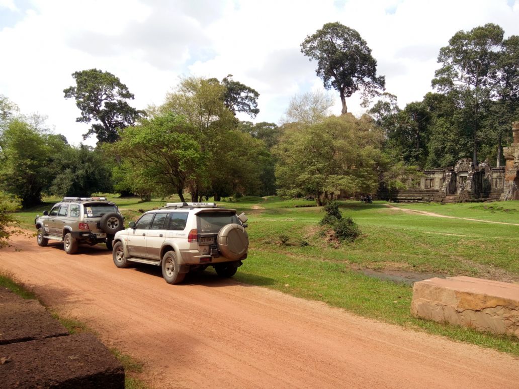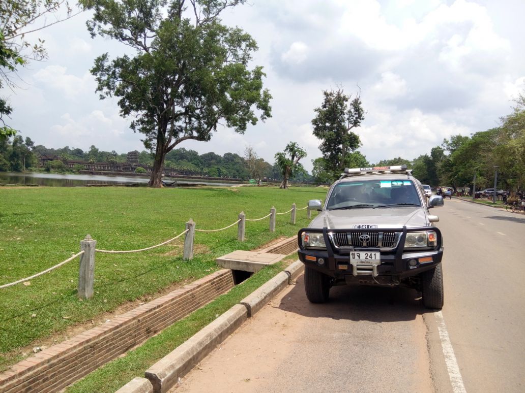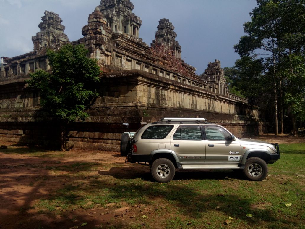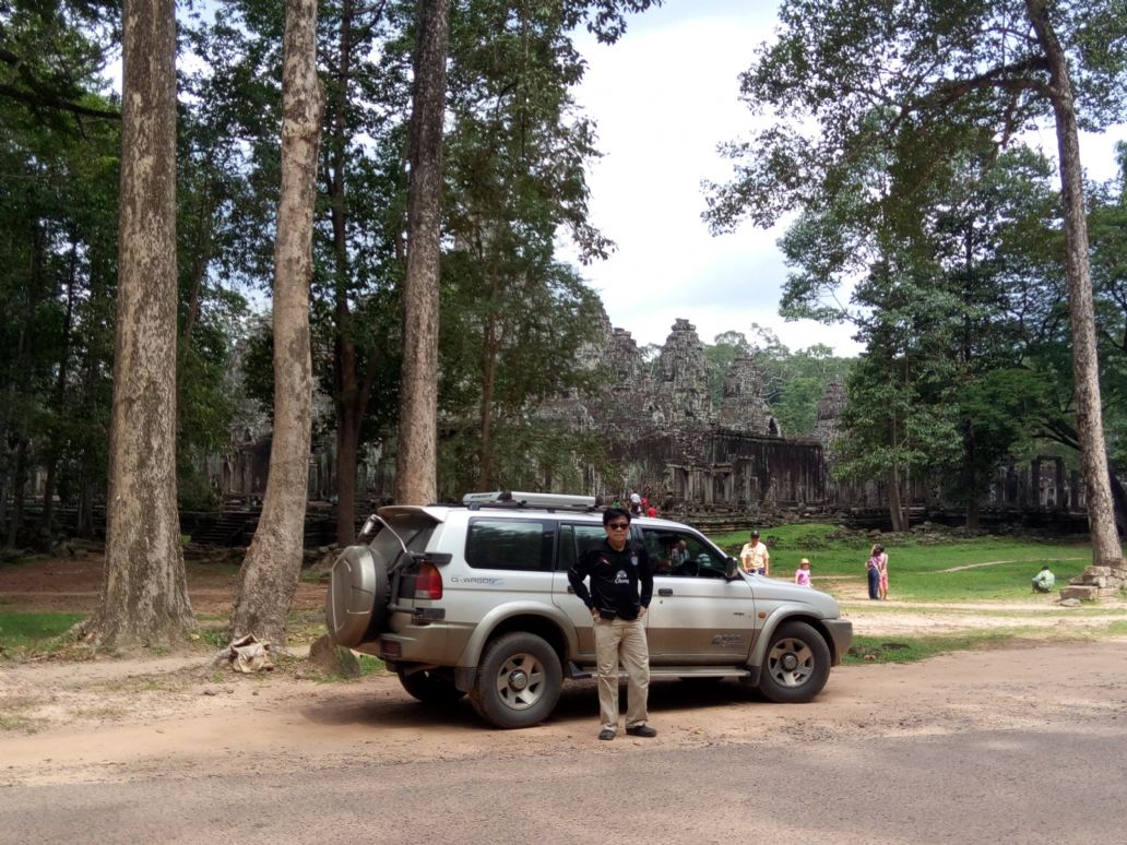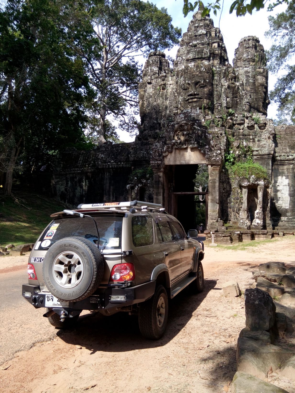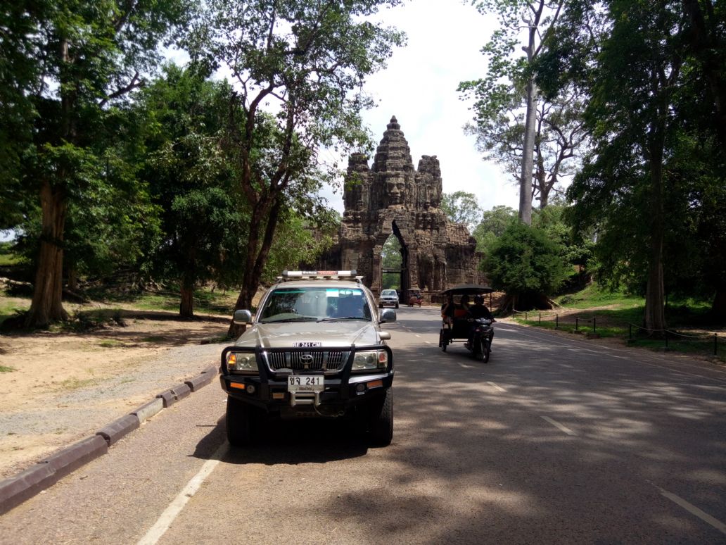 ขับรถลอดซุ้มประตู ที่นครธม เอารถไปเองก็ไม่ต้องไปจ้างรถสามล้อลาก คิดตั้ง 18-20 USD ต่อวัน ไปเองก็ขับเข้าไปได้เลย