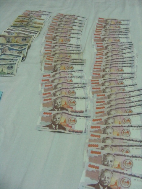 ตอนเก็บใส่กระเป๋าต้องเอาหนังยางรัดเป็นก้อน ๆ มันเยอะมาก กลัวหล่นหาย แยกออกใช้ทีละ 200,000.-กีบ (หกร้อยกว่าบาท)