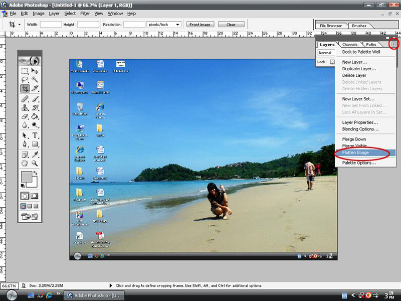 วิธีการ รวมเลเยอร์ โดยการ คลิ๊กไปที่ หัวลูกศรเล็กๆ มุมขวาบน แล้วลากลงมาที่คำว่า Flatten Imag