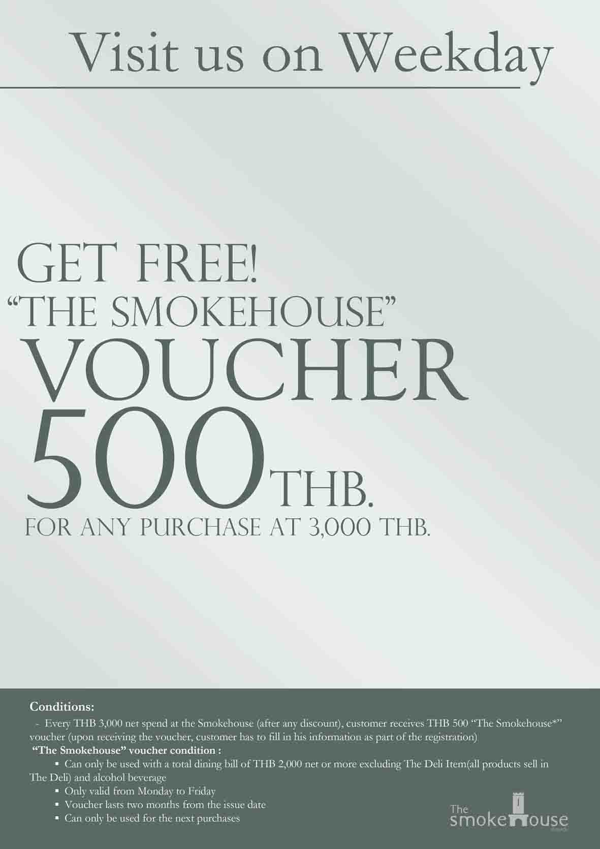 เมื่อเพื่อนๆมาทานอาหารที่ The Smokehouse มูลค่าตั้งแต่ 3,000 บาทขึ้นไป รับฟรี Gift Voucher มูลค่า 500 บาท ทันทีสำหรับนำกลับมาใช้ในโอกาสครั้งต่อไปกับยอดชำระทั้งสิ้น 2,000 บาท และใช้ได้ในวัน จ.-ศ.นะคะ
