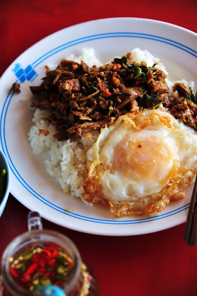 จานแรกข้าวราดกระเพราเป็ด ไข่ดาว