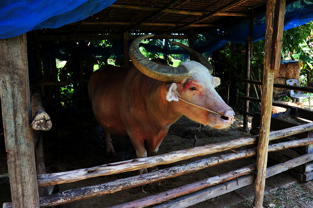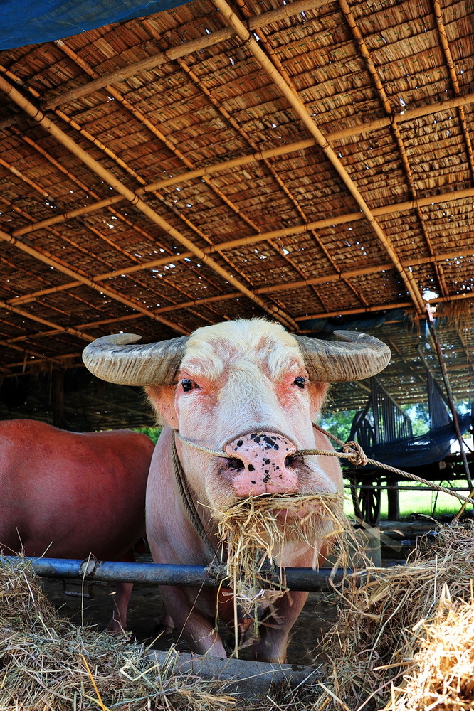 ตัวนี้เป็นควายเผือกแต่พิการนิดๆที่ว่าขามันสั้นไปหน่อย เลยถูกจับแยกมาเลี้ยงเดี่ยวที่คอกนี้