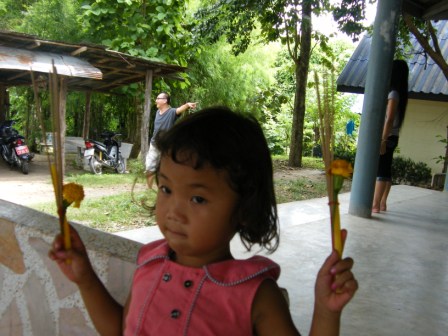 เด็กๆแถวนั้น มาขายดอกไม้ ธูปเทียน ไว้ไปไหว้ ศาลเจ้าพ่อตรงบ่อน้ำร้อนข้างบน ชุดละ 5บาท