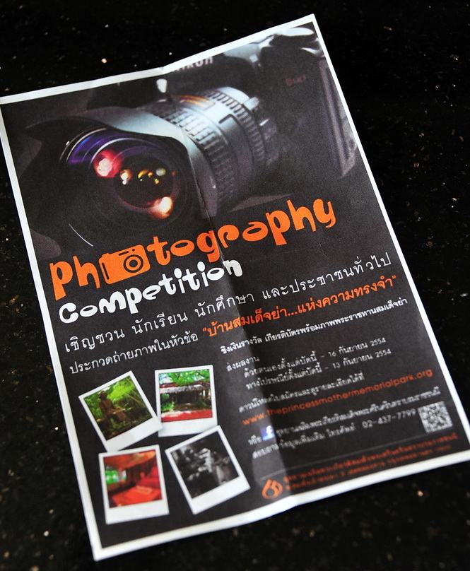 สัญญากับคุณพรเพ็ญ (PR ของสวนสมเด็จย่า) ว่าจะมาเผยแพร่เรื่อง การแข่งขันประกวดการถ่ายภาพ (Photography Competition) ในหัวข้อ " บ้านสมเด็จย่า....แห่งความทรงจำ " ชิงเงินรางวัลและเกียรติบัตรพร้อมภาพพระราชทานสมเด็จย่า ผู้สนใจ( นักเรียน นักศึกษา และประชาชนทั่วไป) สามารถดาวน์โหลดใบสมัครและดูรายละเอียดได้ที่
