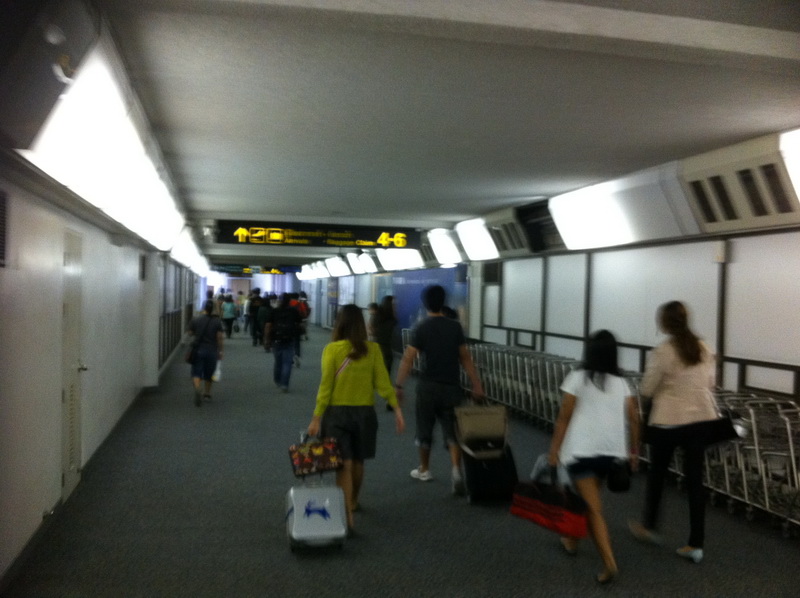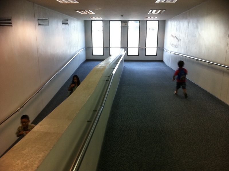 เรียกขึ้นเครื่องแล้ว ทางเดินไปลงงวงวกวนและยาวดีทีเดียว ผมว่าอาคาร 1 นี้มีความสูงมากกว่าอาคารในประเทศเดิมครับ เวลาลงเครื่องเลยต้องเดินลงไปอีกชั้นหนึ่งครับ