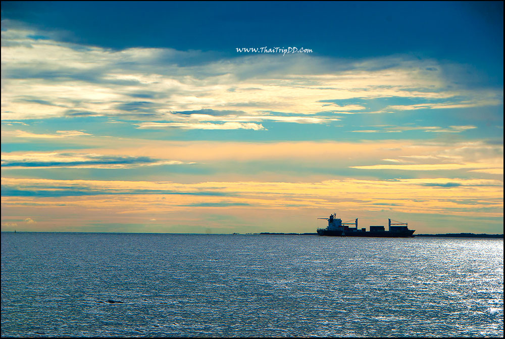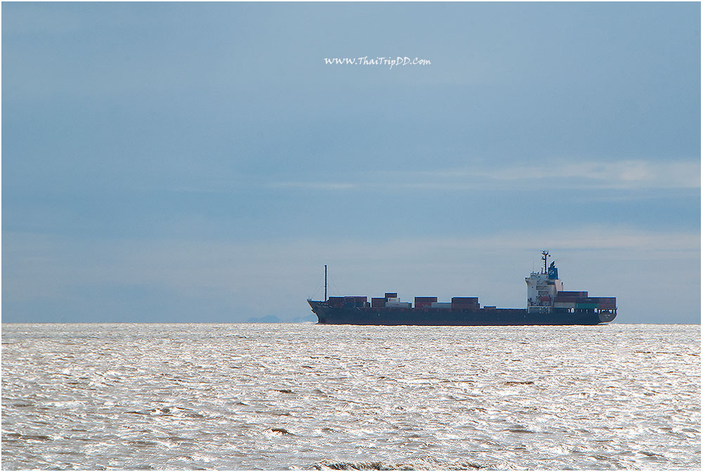 มองไกลออกไปเห็นเรือยักษ์ทิ่งสมอลอยลำอยู่นิ่งสงบ