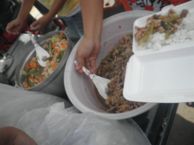 อาหารที่นำไปแจก ผัดกระเพราและผัดผักรวมมิตร พร้อมด้วยฝรั่ง