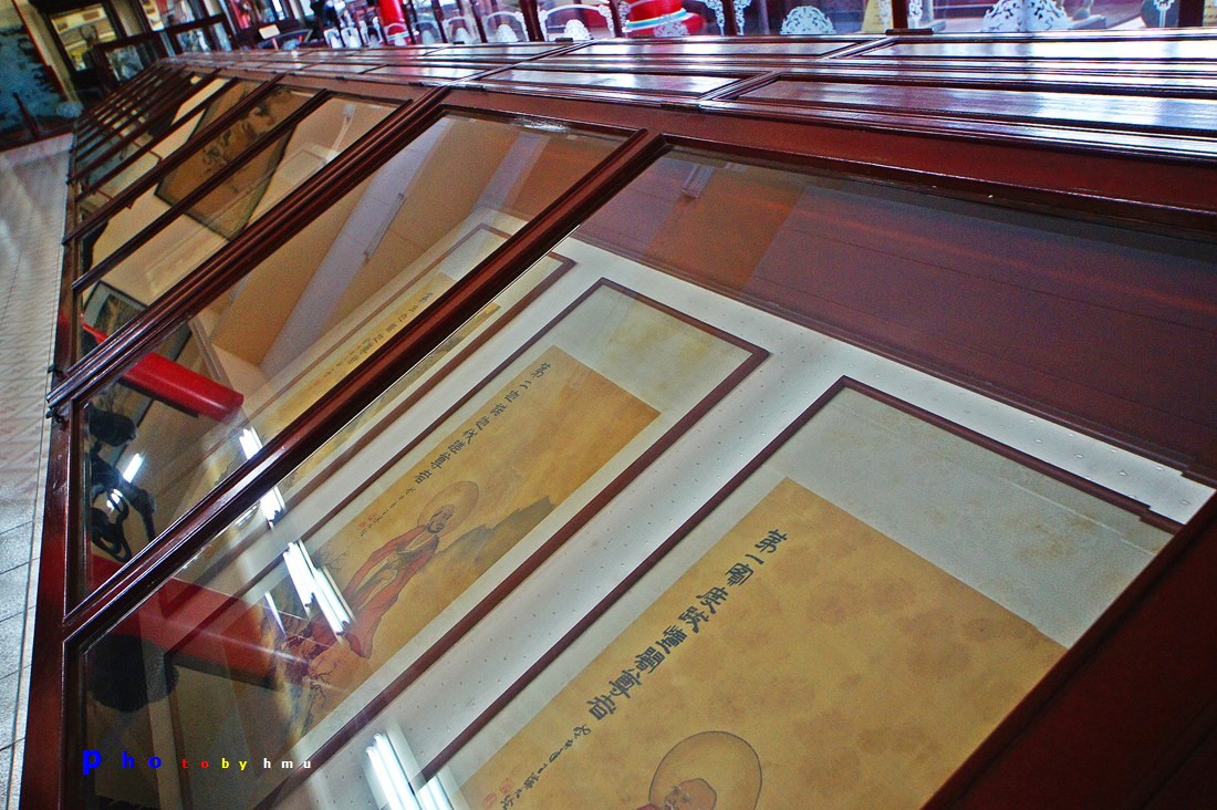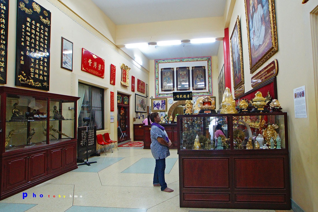2. พิพิธภัณฑ์ จัดแสดงที่ห้องโถงชั้นล่าง ซึ่งจำลองเป็นท้องพระโรงในพระราชวังจีน มีศิลปะวัตถุและโบราณวัตถุที่มีค่าจำนวนมาก เช่น รูปปั้นของทหารและรถม้าที่ขุดได้จากสุสานของจักรพรรดิจิ๋นซีฮ่องเต้ เมืองซีอาน มีอายุกว่า 2,000 ปีเครื่องปั้นดินเผาจีนยุคต่างๆ ภาชนะสำริดโบราณ เครื่องดนตรีจีนโบราณ ภาพเขียนเก่าชุดแปดเซียนซึ่งมีอายุกว่า 500 ปี บัลลังก์ทองของพระจักรพรรดิ แบบจำลองกำแพงเมืองจีน งานฝีมือช่างชาวจีนร่วมสมัย เช่น รูปปั้นดินเผาชุด 18 อรหันต์ จากฝนหมึกลายเก้ามังกร สิ่งของเหล่านี้รัฐบาลจีนได้มอบให้เป็นสมบัติของวิหารเซียน