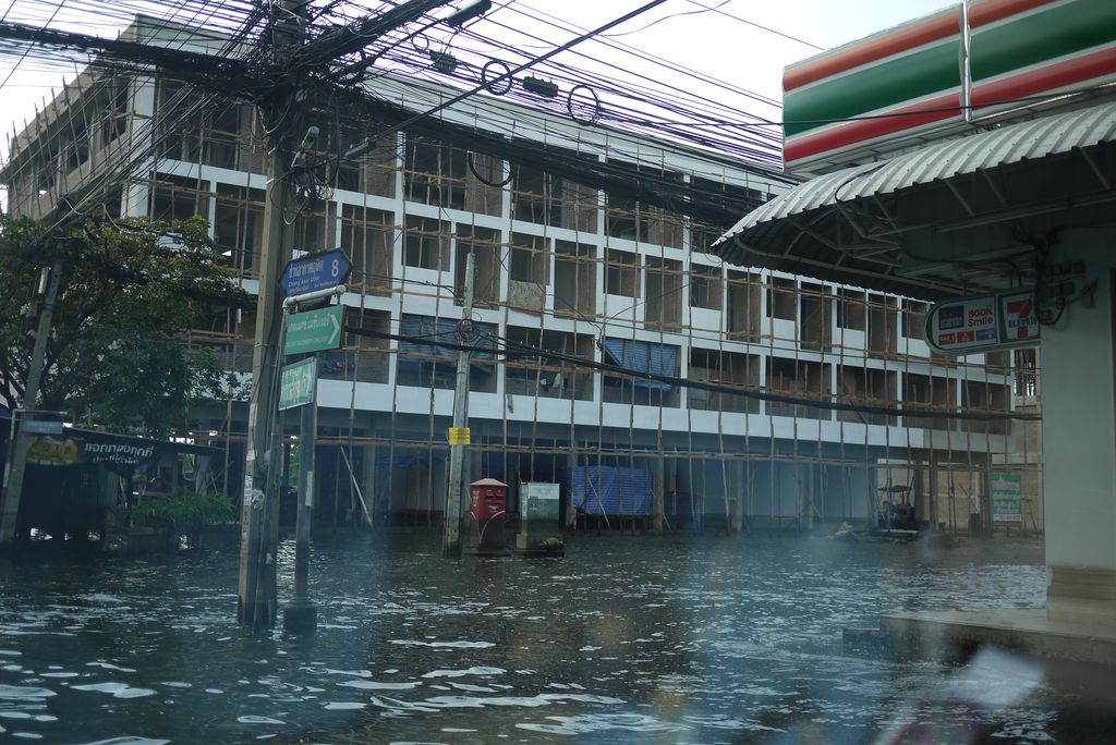 เซเว่นหน้าปากซอย ป้องกันน้ำได้ดีเยี่ยม กระจกแตกไปหนึ่งบาน แต่พอน้ำลดก็ขายของได้ในบัดดล