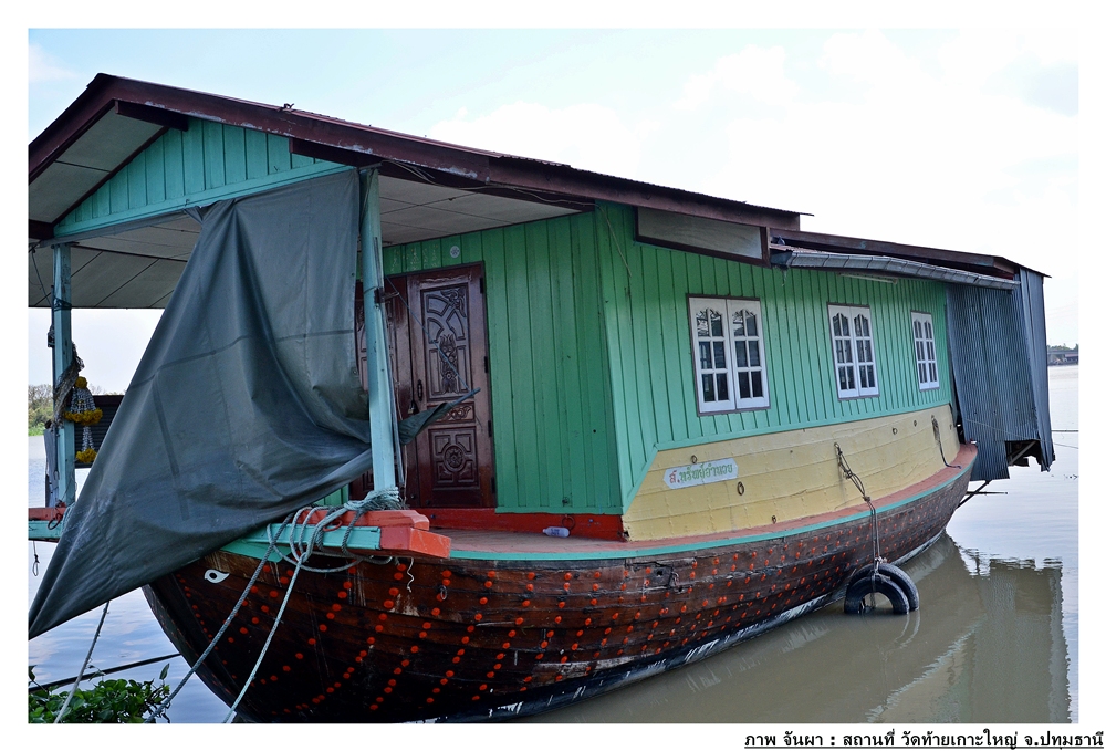 ...... เดินออกมาที่ท่าน้ำ หน้าวัด เห็นเรือลำนี้จอดอยู่ เลยคิดขึ้นมาได้ว่าตอนน้ำท่วมเรือลำนี้จะมีประโยชน์มาก ๆ เป็นบ้านลอยน้ำไปเลย ....