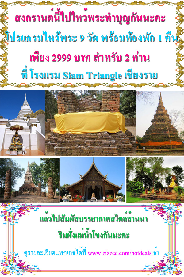 โอ้โห !!! น่าสนใจมาก ๆ เลยใช่มั๊ยคะ แล้วปีนี้ยิ่งเป็นปีชงของหลายๆ ท่านนะคะ ควรจะไหว้พระเสริมบุญเพื่อแก้ดวงปีชงด้วยนะคะ ยังไม่หมดแค่นี้นะคะ โปรแกรมไหว้พระ 9 วัดชื่อดังของเมืองเชียงราย ได้มารวมอยู่ในแพคเกจที่พักราคาถูกพร้อมไหว้พระ 9 วัด เรียบร้อยแล้วล่ะค่ะ โห !!! ได้เที่ยวแบบอิ่มบุญแถมมีที่พักราคาถูกแบบนี้พลาดไม่ได้แล้วนะคะ