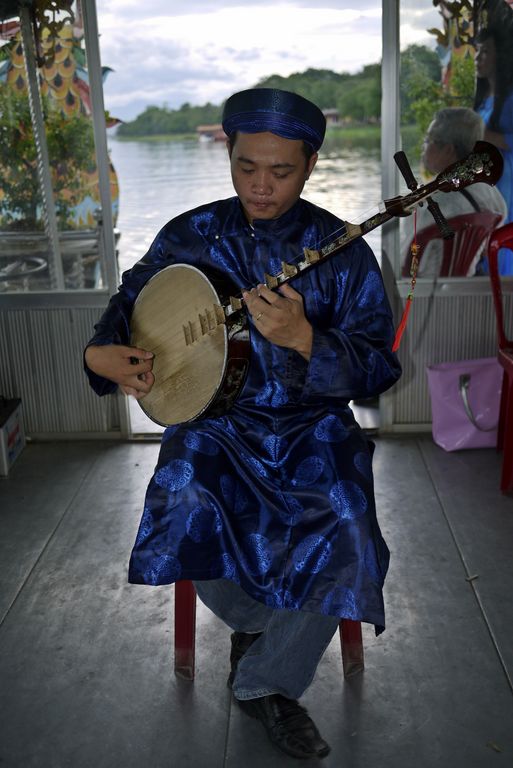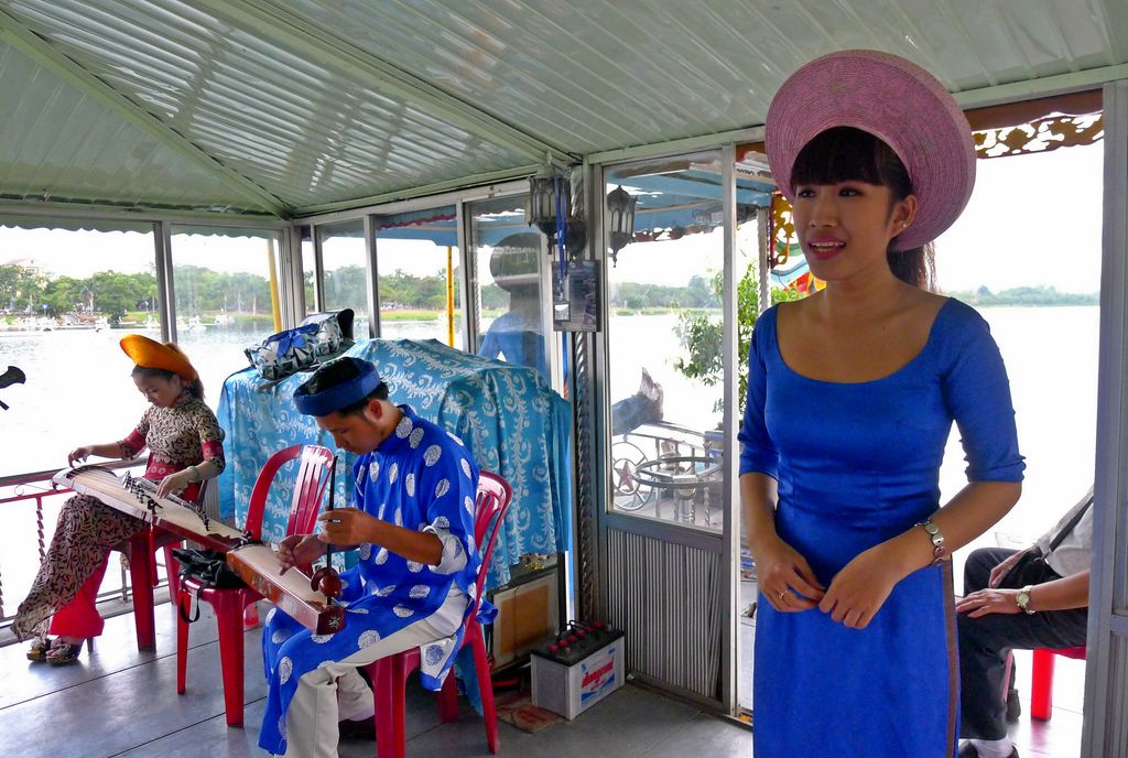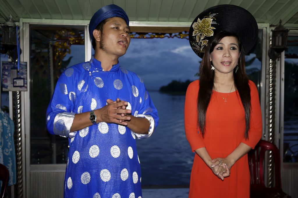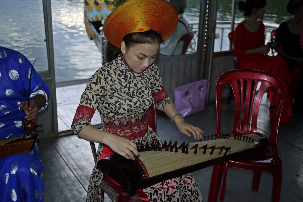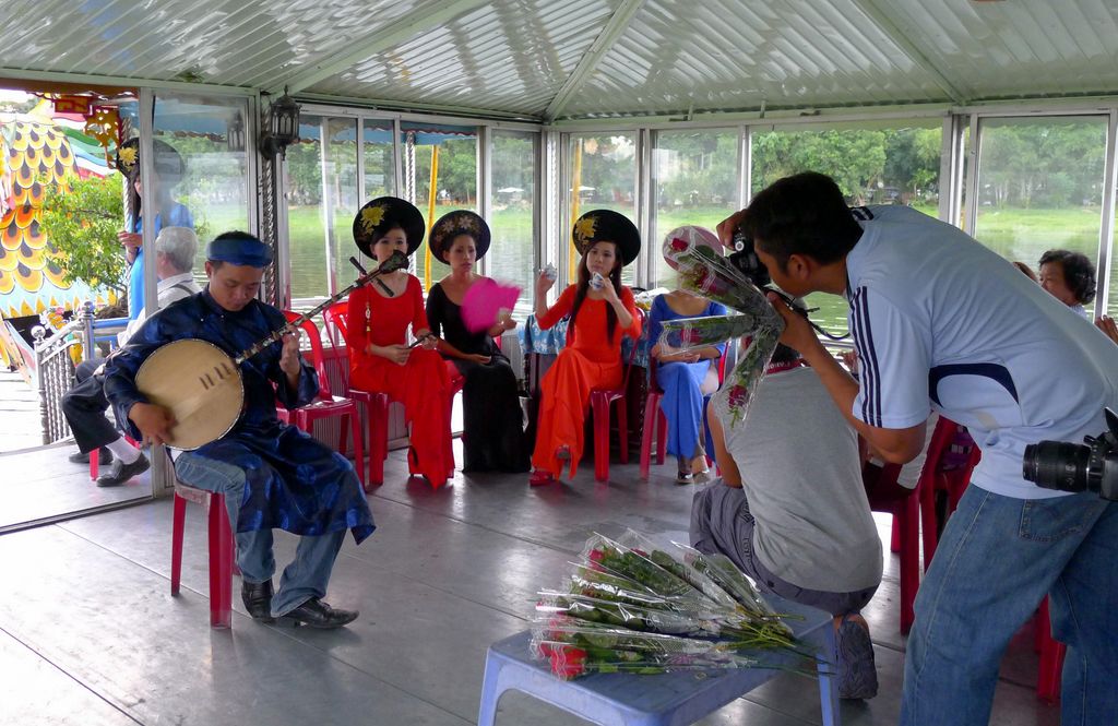 โดยเรือจะไม่ล่องไปไกลเหมือนในตอนกลางวัน แต่จะล่องไปตามสายน้ำหอมเอื่อยๆ ท่ามกลางศิลปินนักร้องนักดนตรีที่มาบรรเลงเพลงพื้นเมืองให้ฟังกันสดๆด้วยเครื่องดนตรีที่เป็นเอกลักษณ์ของเวียดนาม
