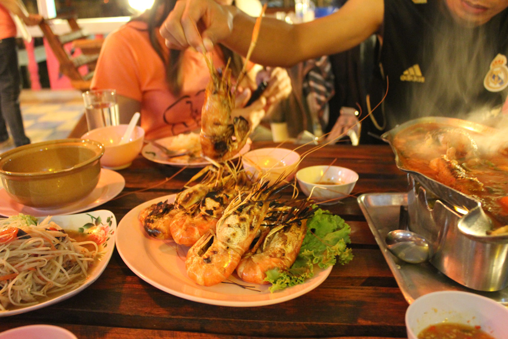 มาแม่สอด ไม่ต้องห่วงเรื่องอาหาร การกิน เป็นเมืองที่เริ่มมีสีสันยามค่ำคืน มีที่ให้นั่งฟังเพลง ดื่มด่ำๆเยอะมากมาย แล้วแต่ชอบครับ แต่ผมเลือกที่จะกิน...อยากกินกุ้งเผานี่เลยครับ อ.กุ้งเผา สาขาแม่สอด อยู่ทางไป ตลาดริมเมย แต่อยู่ทางขวามือนะครับ ร้านตั้งอยู่จุดที่ ยังไม่ถึงตลาดริมเมย