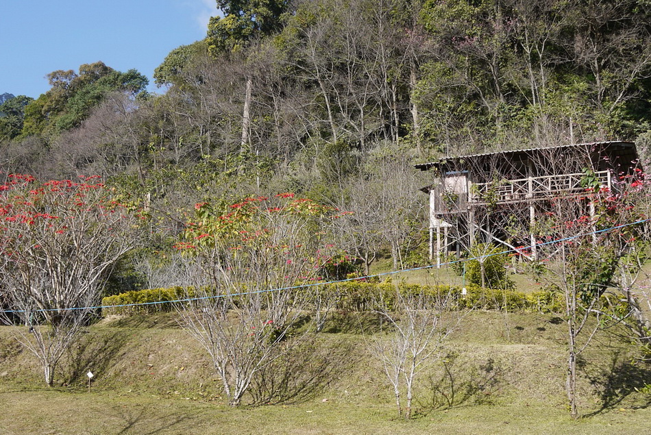 จากมุมนี้จะเห็นแต่กิ่งที่ผลัดใบไม่มีสีสันของดอกเลย ขณะที่ต้นซ้ายมือมีดอกพร้อมกับผลิใบอ่อนแล้วครับ