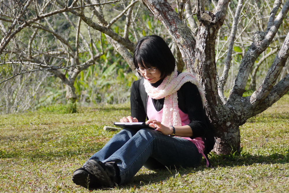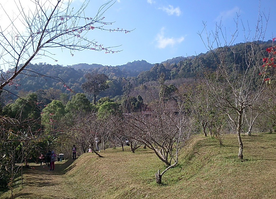 นั่งพักใต้ต้นท้อ ซึ่งมีดอกแทบจะนับได้เลยครับ