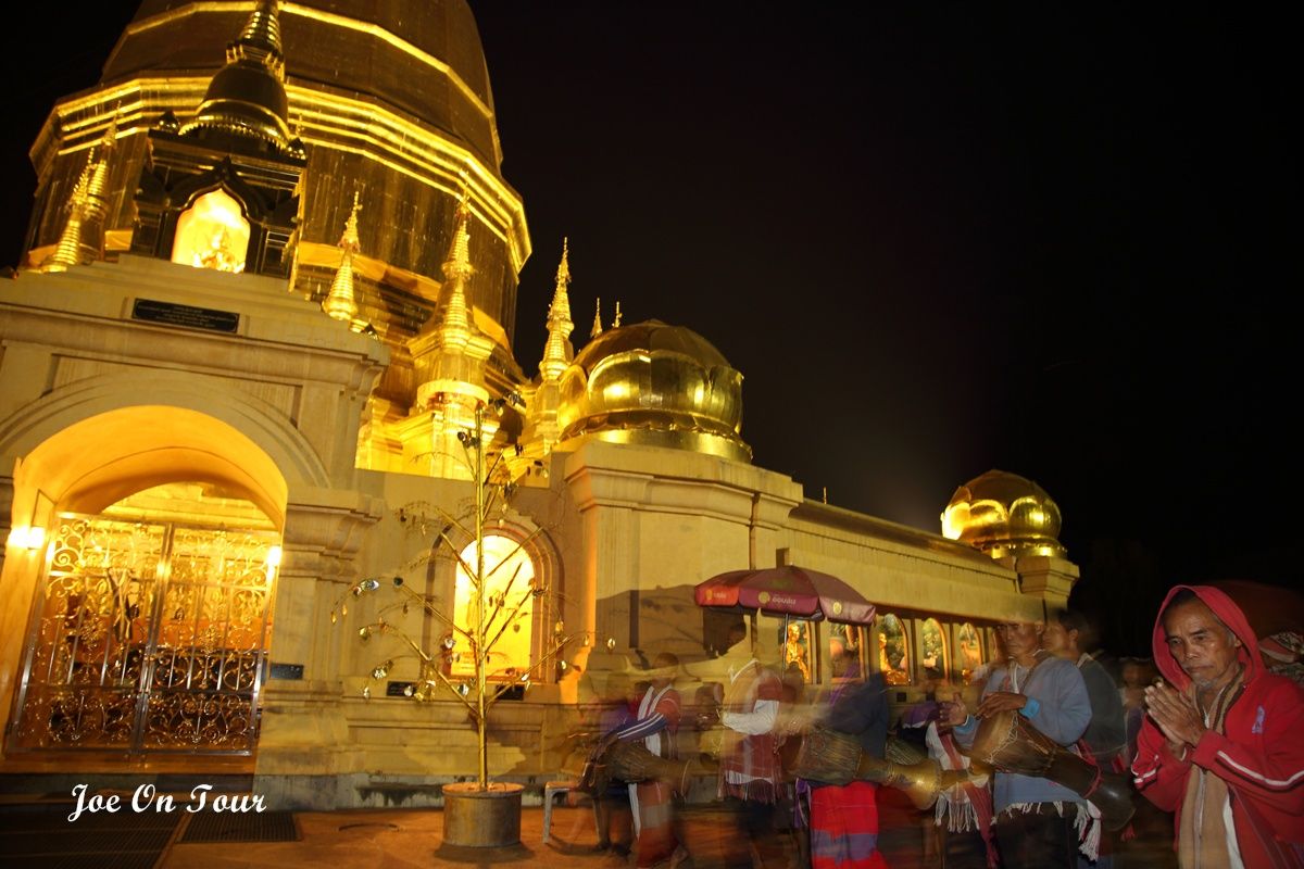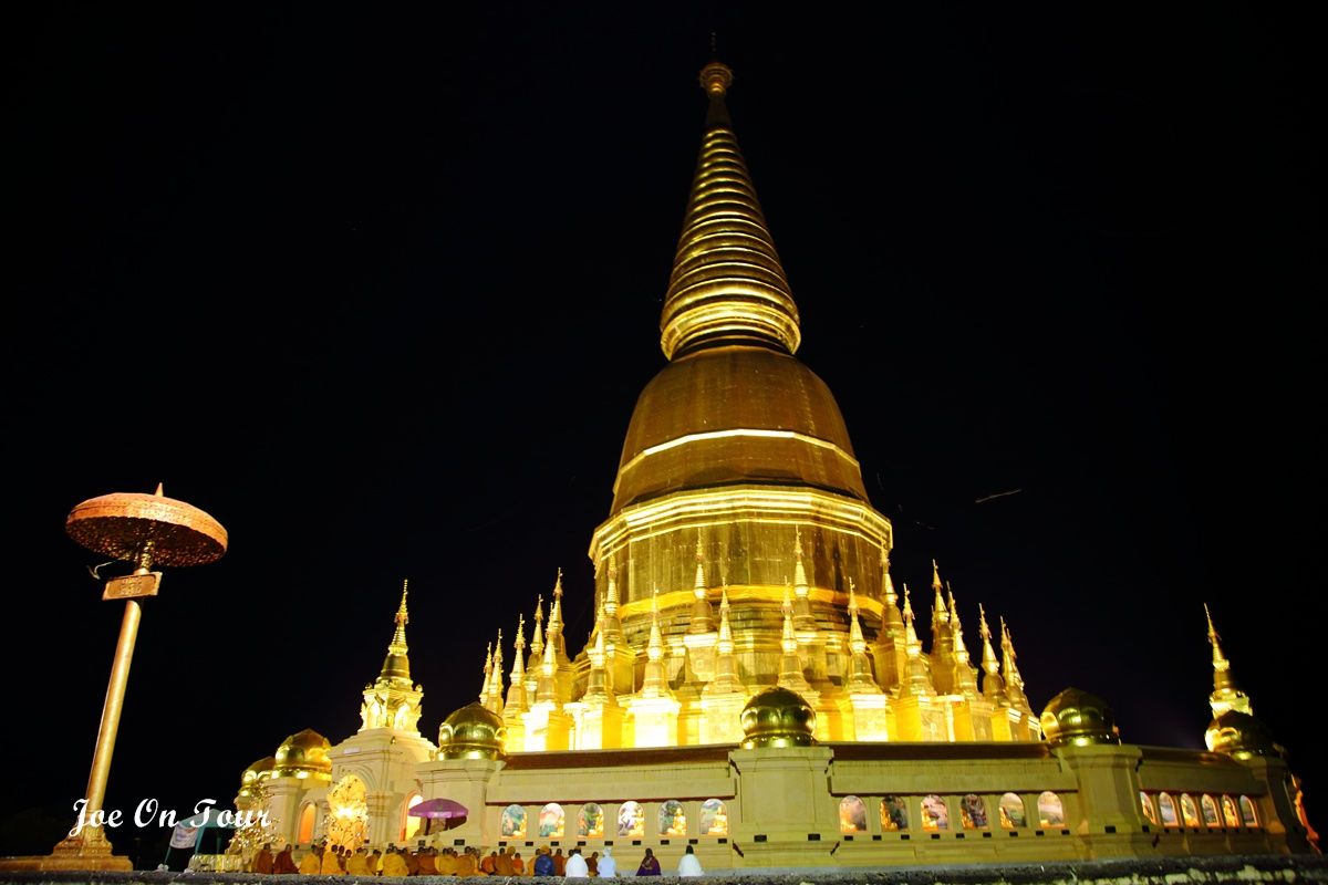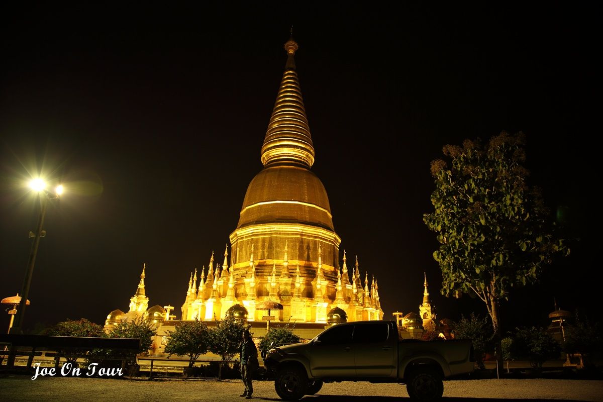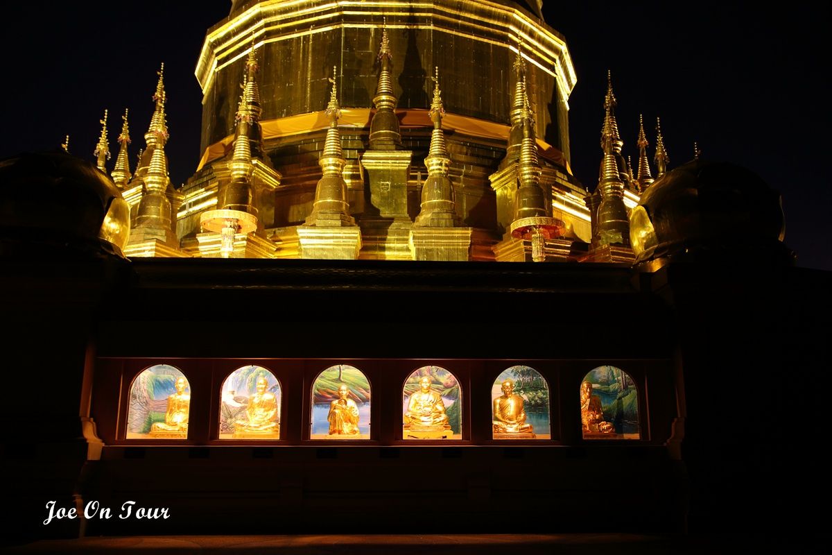 ตอนที่ออกจากที่ทำการ อช.แม่ปิง ไม่ได้คิดที่จะแวะที่ไหนแล้วครับ แต่ระหว่างทางได้เห็นพระมหาธาตุเจดีย์ สีทองอร่ามสวยเด่นอยู่ในความมืดจึงได้แวะเข้ามานมัสการ และตอนกลับก็ได้เกิดเรื่องแปลกๆขึ้นพอพ้นประตูวัดออกไปจีพีเอสที่ได้ตั้งพิกัดไว้แล้วก็เกิดอาการเพี้ยนเอาดื้อพาหลงหาทางออกจากหมู่บ้านไม่ได้ซะงั้น อดีนาลีนพุ่งปรี๊ด