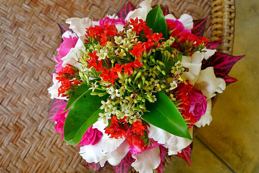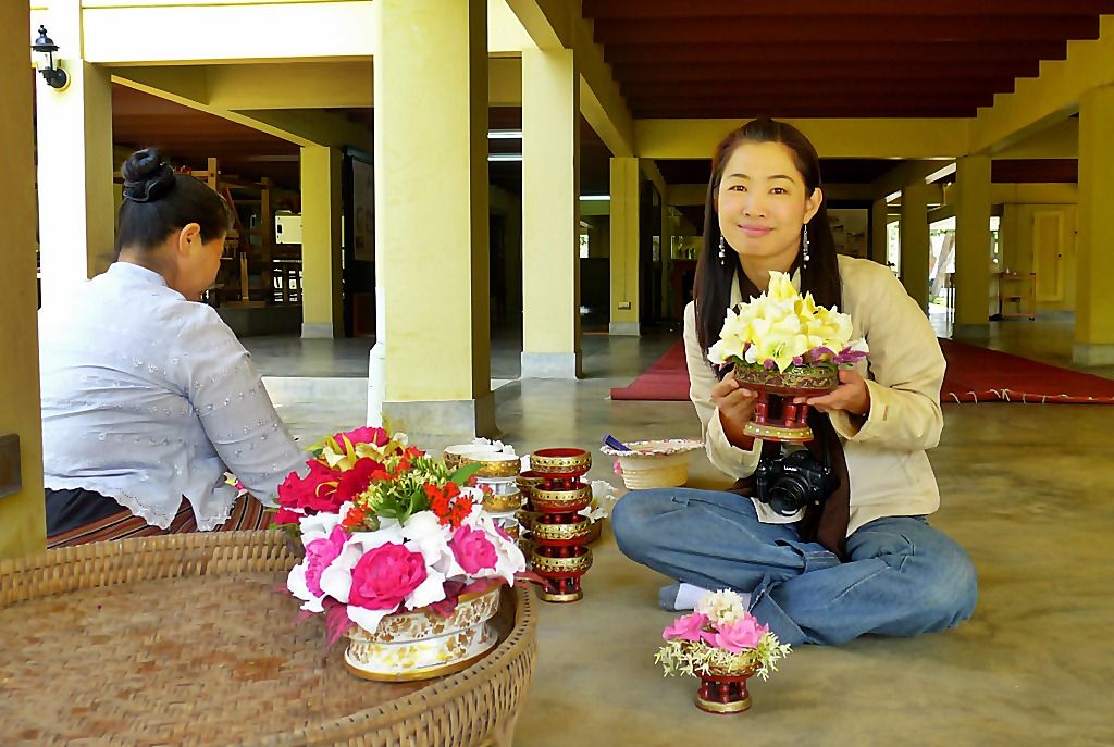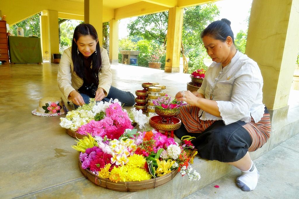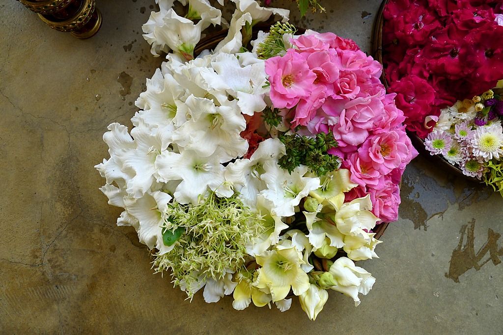 ป้าเจ้าหน้าที่บอกว่ากำลังจัดดอกไม้จะนำไปถวายข้างบน ให้ช่วยจัดตามใจชอบเพื่อนำไปบูชาด้วย..