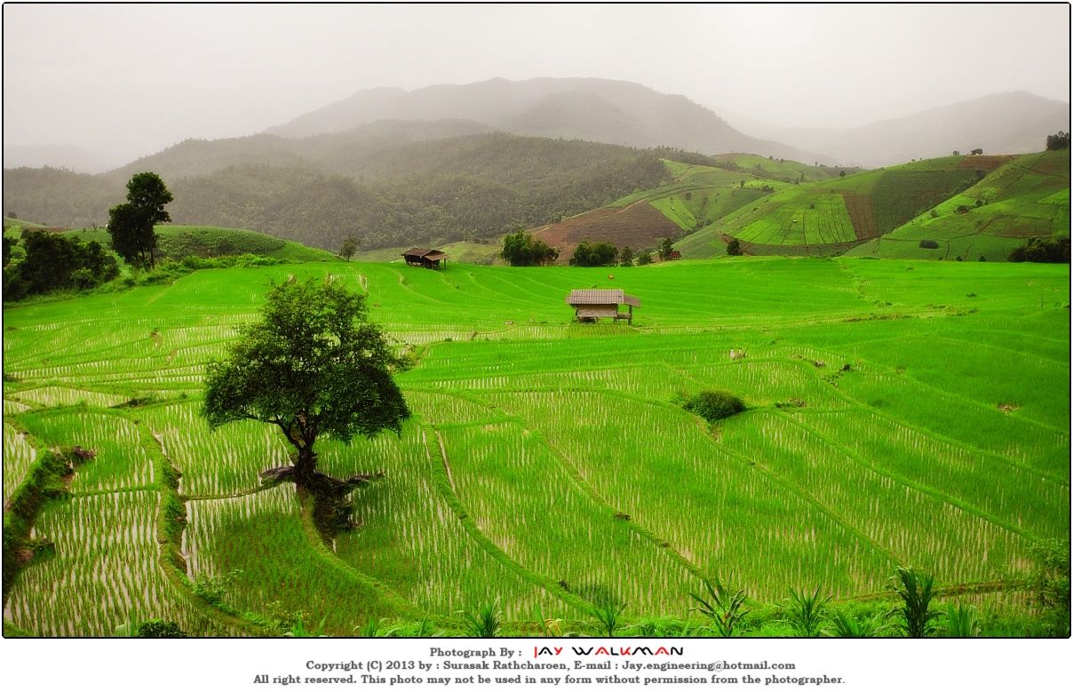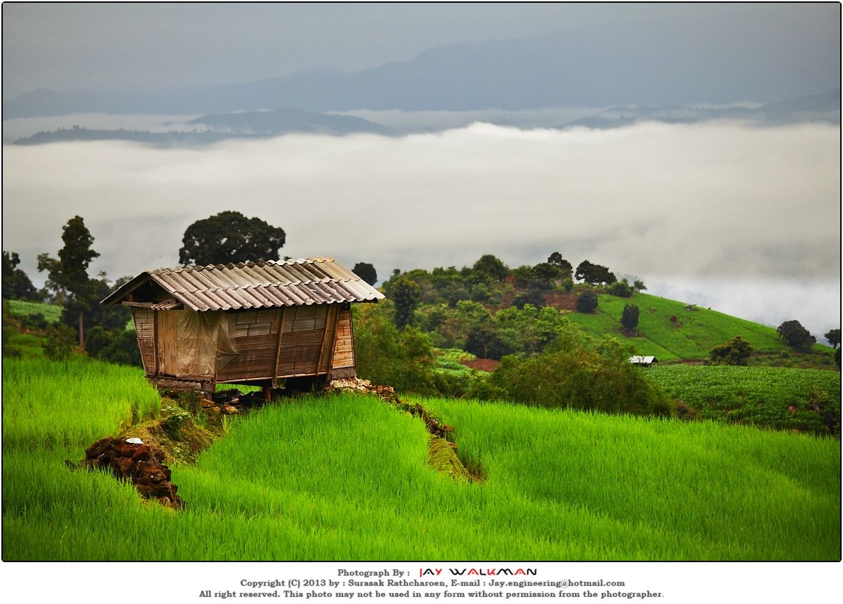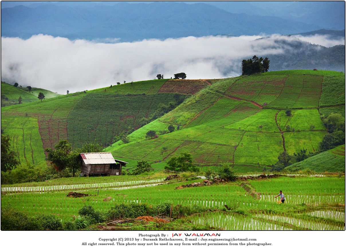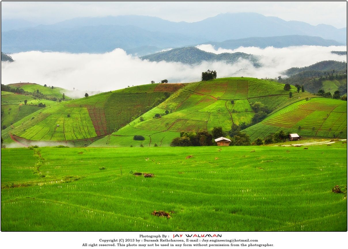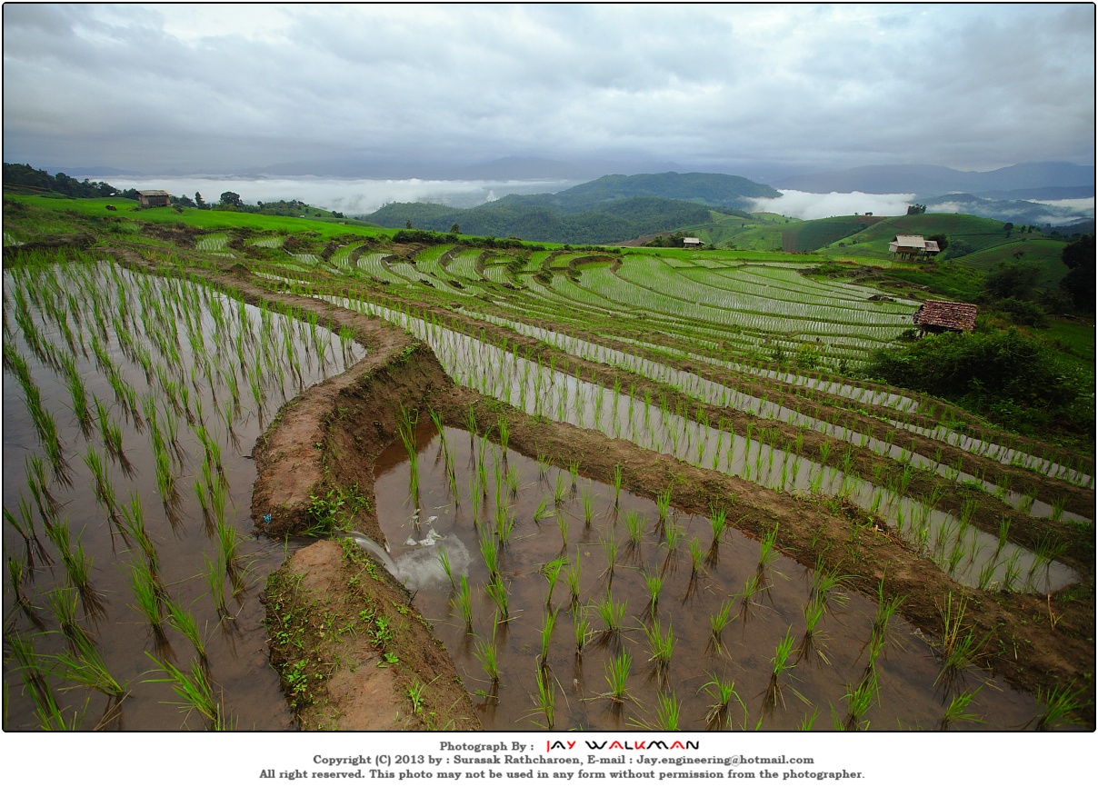 หลังจากแน่ใจแล้วว่าฝนคงหยุดตก ผมจึงเดินเข้าไปในคันนาลึกเข้าไปอีก เสียงน้ำที่ชาวนาขุดเป็นร่องทางเดินน้ำกระทบเป็นชั้นๆ ไพเราะมากๆกับวิวบรรยากาศหลังฝนตกนี้สุดยอดไปเลย สายหมอกเริ่มจับตัวเป็นก้อนๆ ลอยคลอเคลียอยู่ด้านหน้า ยืนมองวอวนี้อยู่คนเดียวกลางนาปงเปียง อยากจะเก็บ Moment ไปนานๆจริงๆ