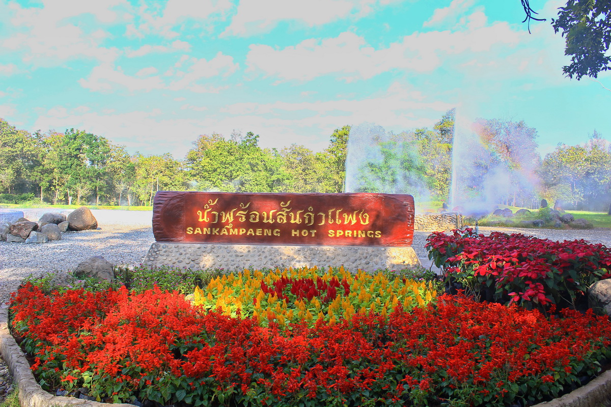 หลังจากเติมน้ำมันที่สะเมิง ก็ออกเดินทางต่อในเวลา 5 โมงเย็น จุดหมายปลายทางคืนสุดท้ายที่จะนอนในคืนนี้คือ น้ำพุร้อนสันกำแพง กว่าจะถึง ก็มืดแล้ว ประมาณ 1 ทุ่ม แวะซื้อไก่ย่างหน้าปากทางเข้า แหนมย่างและก็ใส้กรอกอีสาน แล้วมาซื้อส้มตำข้าวเหนียวไก่ย่างและน้ำหน้าประตูอีกที ติดต่อขอกางเต้นท์ ค่าผ่านประตูคนละ 40 บาท ค่ากางเต้นท์อีกคนละ 50 บาท แพงน่าดู เพราะก่อนหน้านี้เก็บแค่ 40 บาทเอง แถมนำบัตรไปแลกตักอาบได้อีกด้วย อย่างว่า ทุกวันนี้เป็นพาณิชย์ไปหมดแล้ว ยังดีที่เขาปรับปรุงสถานที่และห้องน้ำ สะอาดสะอ้าน มีคนดูแลตลอดเวลา มีที่แช่ขาจำนวนมาก